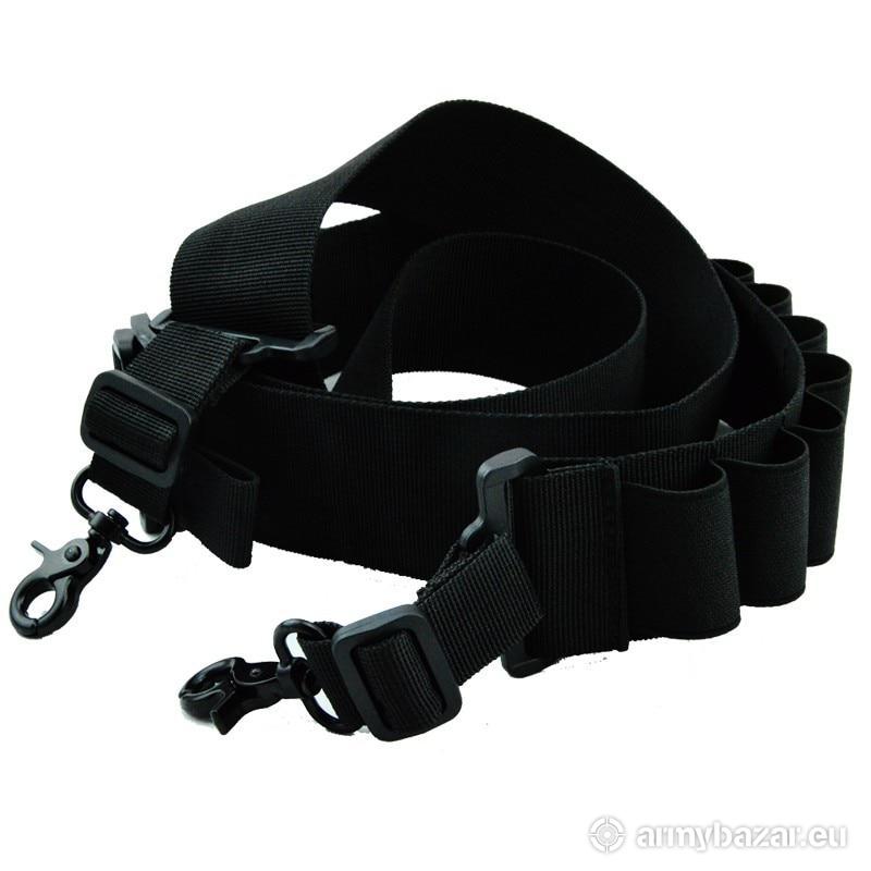 Opis: Dwupunktowe zawieszenie taktyczne z uchwytem na naboje kal. 12 / 20 gauge w kolorze CZARNYM. Pas posiada miejsce do przenoszenia 15 sztuk naboi do broni śrutowej. Pasy wykonane z wytrzymałego i odpornego NYLONU 800 D oraz stali.Stalowe obrotowe uchwyty oraz solidny pas pozwalają na bezproblemowe i komfortowe przenoszenie broni oraz amunicji.Zawieszenie posiada regulację długości w zakresie od 104 cm do 140 cm, dzięki czemu można go używać nawet z pełnym wyposażeniem. DANE FABRYCZNE:Materiał: nylon 800 D Możliwość przenoszenia amunicji: TAK - 15 sztuk Uchwyty: stalowe obrotowe. Długość pasa: 104 – 140 cm Szerokość pasa: 5 cm Waga: 140 g.