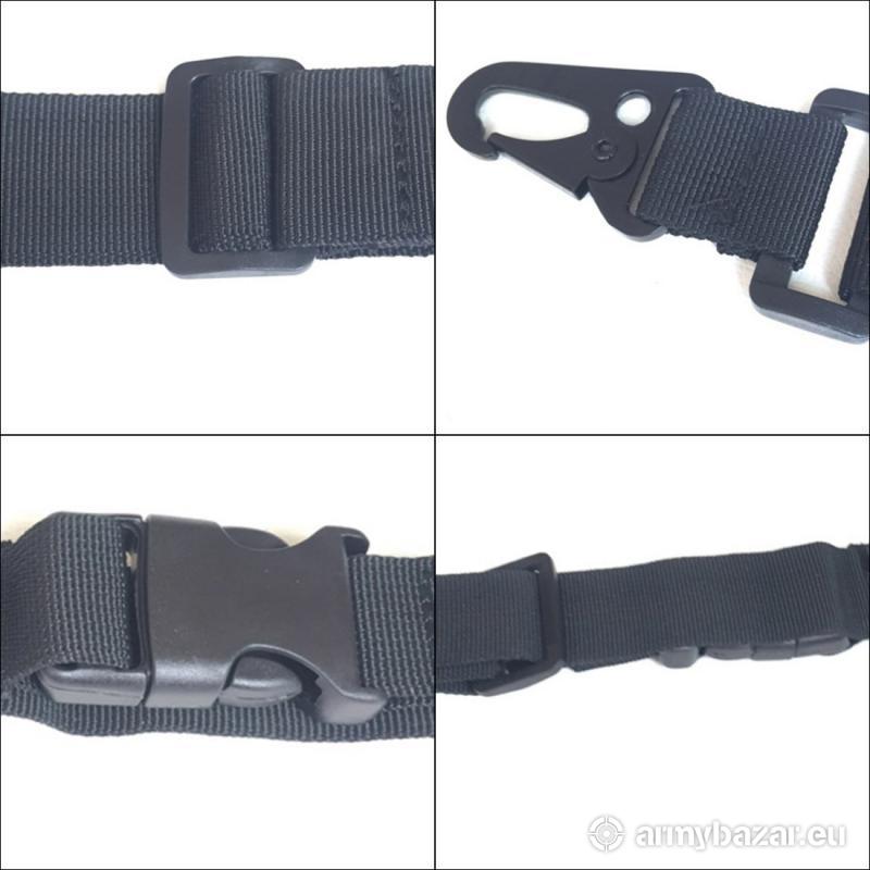Opis: Wysokiej JAKOŚCI jedno / dwupunktowe zawieszenie taktyczne, pas nośny do broni strzeleckiej, wiatrówek, replik ASG w kolorze CZARNYM. Pasy wykonane z wytrzymałego i odpornego NYLONU oraz metalu. Solidne chwyty oraz wytrzymały pas pozwalają na bezproblemowe i komfortowe przenoszenie broni czy repliki. Możliwość stworzenia dodatkowego punktu zawieszenia na kolbie teleskopowej lub ramowej (jak na zdjęciu poniżej). Zawieszenie posiada regulację długości w zakresie do 135 cm, dzięki czemu można go używać nawet z pełnym wyposażeniem. Możliwość szybkiej zmiany z dwóch punktów zawieszenia do jednopunktowego ! DANE FABRYCZNE: Materiał: nylon Długość pasa: do 135 cm Szerokość: 38 mm.