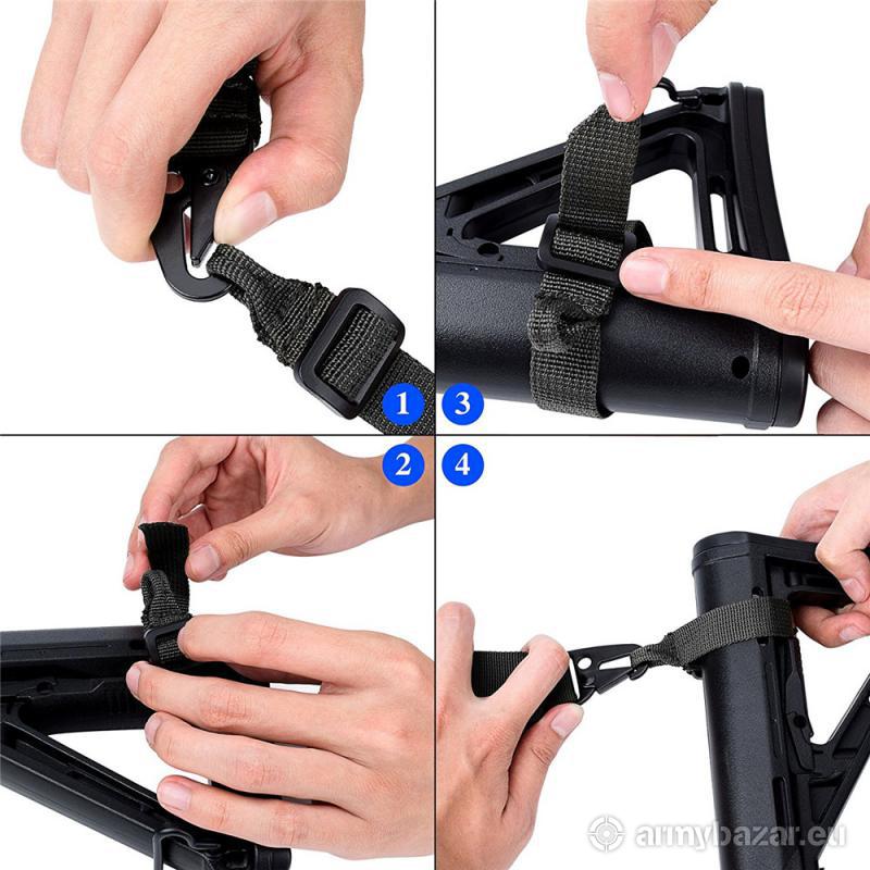 Opis: Wysokiej JAKOŚCI jedno / dwupunktowe zawieszenie taktyczne, pas nośny do broni strzeleckiej, wiatrówek, replik ASG w kolorze CZARNYM. Pasy wykonane z wytrzymałego i odpornego NYLONU oraz metalu. Solidne chwyty oraz wytrzymały pas pozwalają na bezproblemowe i komfortowe przenoszenie broni czy repliki. Możliwość stworzenia dodatkowego punktu zawieszenia na kolbie teleskopowej lub ramowej (jak na zdjęciu poniżej). Zawieszenie posiada regulację długości w zakresie do 135 cm, dzięki czemu można go używać nawet z pełnym wyposażeniem. Możliwość szybkiej zmiany z dwóch punktów zawieszenia do jednopunktowego ! DANE FABRYCZNE: Materiał: nylon Długość pasa: do 135 cm Szerokość: 38 mm.