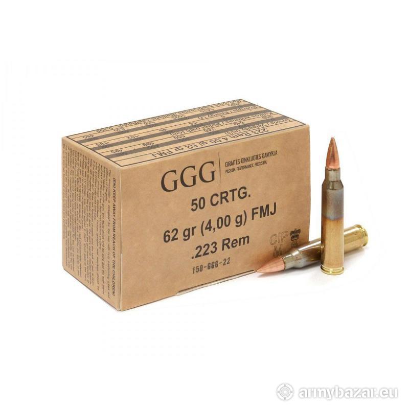 Opis: Amunicja kulowa GGG centralnego zapłonu w kalibrze .223 Rem z pociskiem pełnopłaszczowym FMJ. Waga pocisku 62 gr / 4,00 g. Opakowanie zawiera 50 sztuk