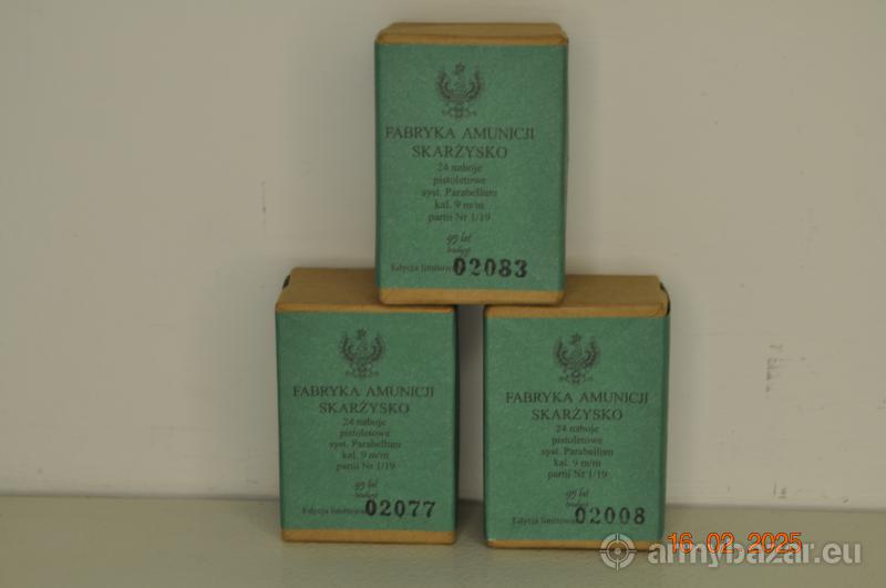 Opis: Oferuję pudełko amunicji okolicznościowej limitowanej na 95-lecie firmy Mesko. Amunicja 9x19mm Para w kartoniku stylizowanym na opakowanie przedwojenne, zawierające 24 sztuki naboi pięknie sygnowanymi m.in. orłem - znakiem przedwojennej fabryki PFA Skarżysko. Pudełko kompletne- NIGDY nie otwierane nie kombinowane- IDEALNE! ZAPRASZAM OSTATNIE SZTUKI Na maila proszę składać propozycję cenowe.
