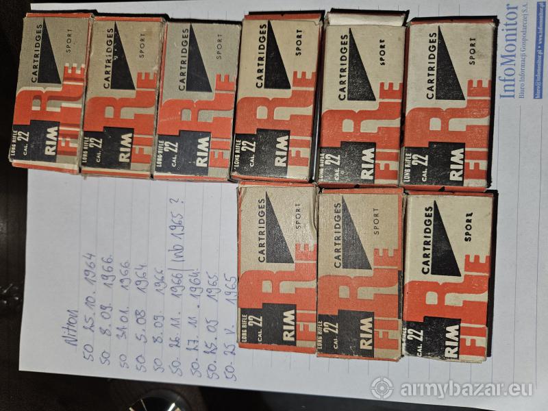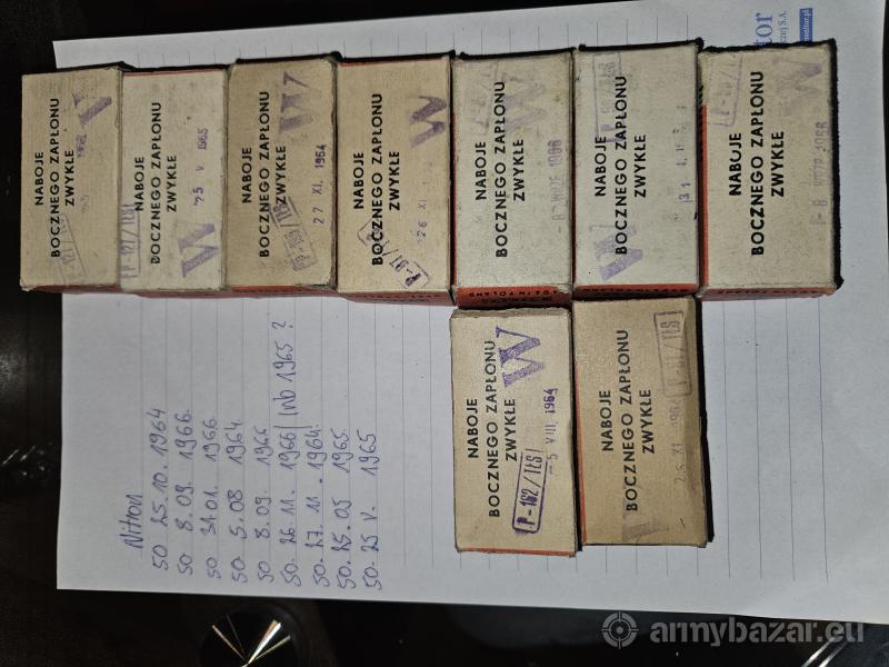 Opis: Dla kolekcjonerów unikatowa amunicja bocznego zapłonu 22 roczniki 1964,1965,1966 wszystko orginalne jak na zdjęciach. Cena 10zł za sztukę 500zł za paczkę.
