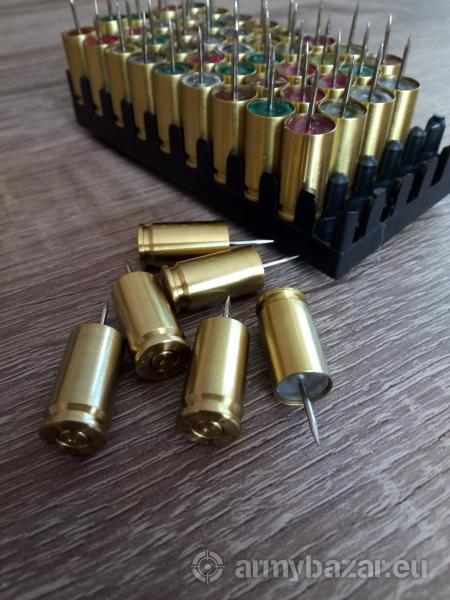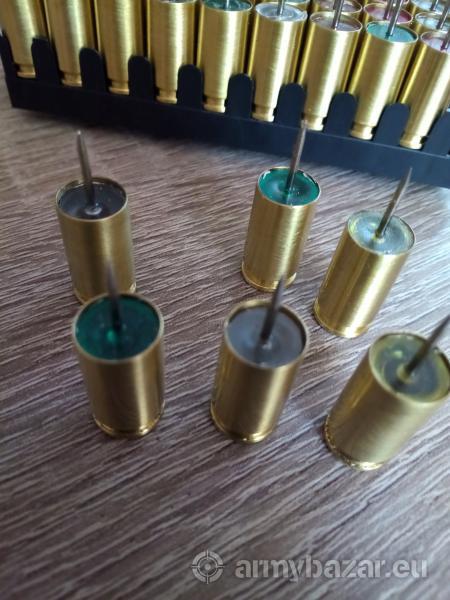 Opis: Pinezki zrobione z mosiężnych łusek pistoletowych 9mm. Łuski były polerowane i polakierowane. W koszyczku znajduje się 50 sztuk. Mogę wysłać Pocztą Polską na koszt kupującego.