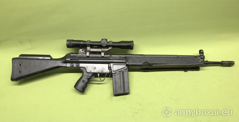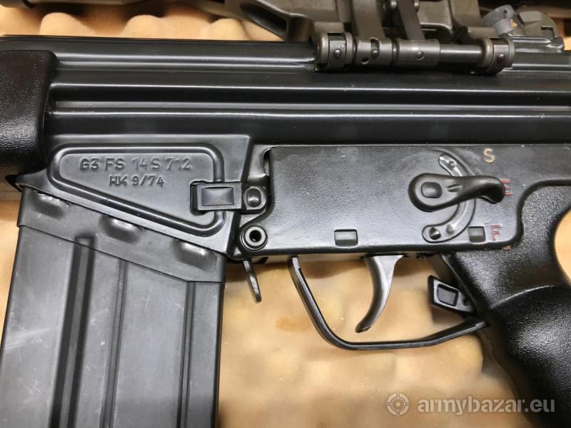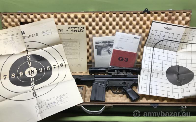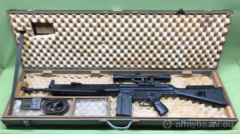 Opis: Karabin samopowtarzalny HK G3SG1 to broń strzelca wyborowego opracowana na bazie karabinu G3. Automatyka broni działa na zasadzie odrzutu zamka półswobodnego hamowanego opóźniaczem rolkowym. Od standardowego G3 wyróżnia się lepszymi parametrami skupienia oraz odmiennym mechanizmem spustowym, wyposażonym w przyspiesznik. Broń w stanie bardzo dobrym, zgodna numerycznie włącznie z optyką oraz kufrem. Lufa w stanie idealnym - lustro. Optyka w stanie bardzo dobrym, obraz czysty i wyraźny. W komplecie z karabinem znajduje się dokumentacja oraz karty przystrzelania fabrycznego. Więcej zdjęć na: www.fmjspj.pl