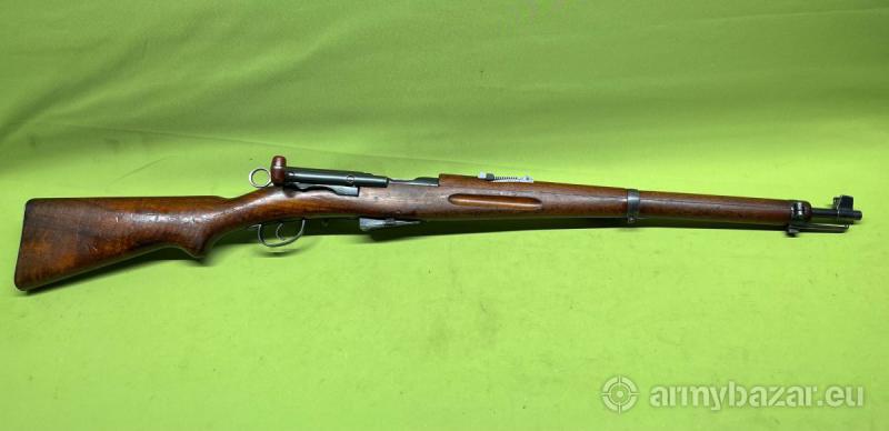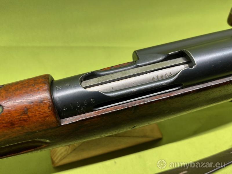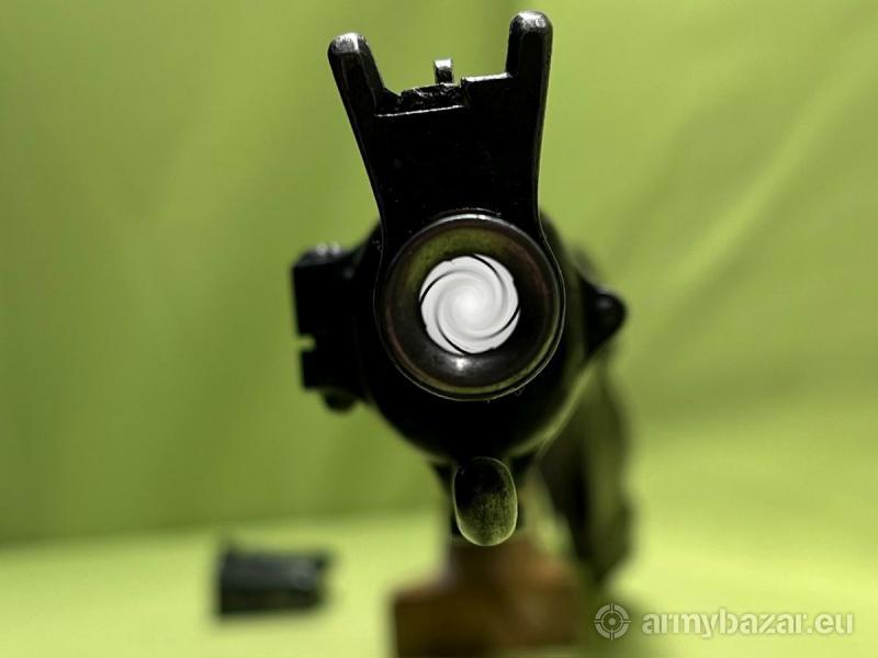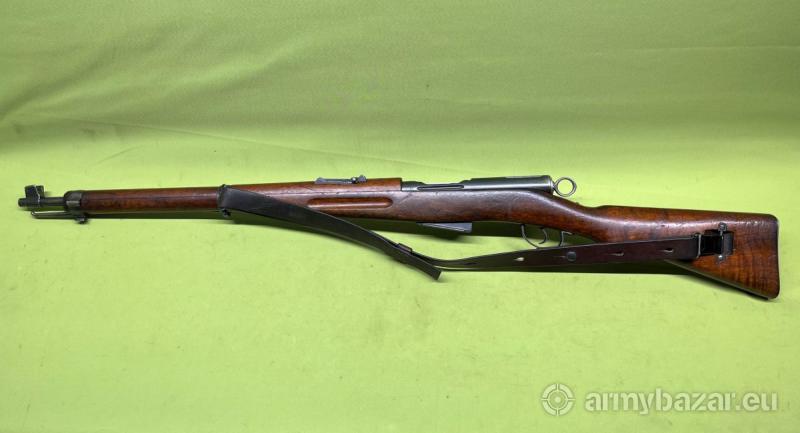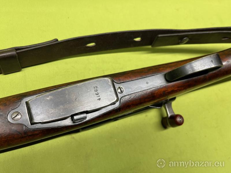 Opis: Szwajcarski karabin powtarzalny Schmidt-Rubin K11 w kalibrze 7,5x55Swiss. Egzemplarz w pięknym stanie, wyprodukowany w 1916 roku i dwukrotnie poddany przeglądowi. Brak puncy P** wskazuje, że prezentowany egzemplarz nie został sprzedany na rynek cywilny. Lufa praktycznie w stanie fabrycznym. Brak współczesnych atestów. Zamek posiada wariant rączki zwany Winter-Riegel. W komplecie oryginalny pas nośny.