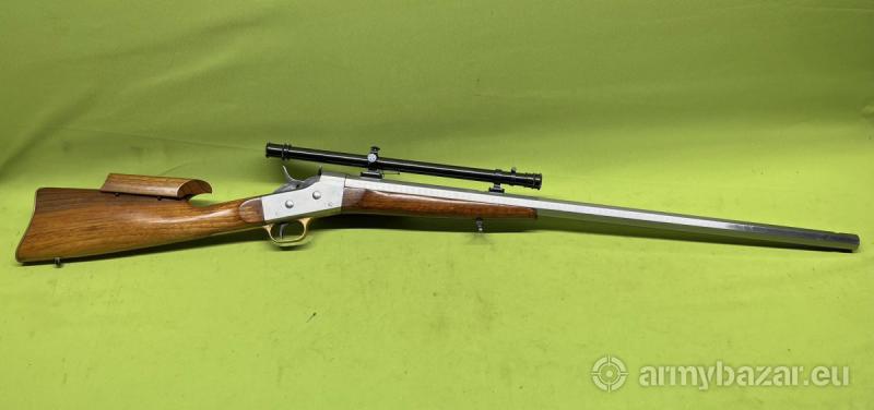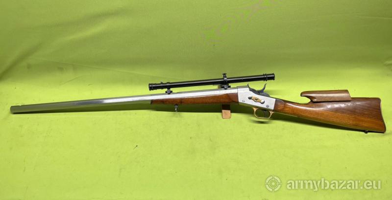 Opis: Karabin jednostrzałowy Rolling Block kal. 45-70 govt. wyprodukowany przez firmę Davide Pedersoli we Włoszech. Sprzedawany egzemplarz broni jest w stanie bardzo dobrym. Lufa idealna - lustro. Jest to rzadka wersja wykonana ze stali nierdzewnej będąca repliką egzemplarzy używanych przez kompanie reprezentacyjne w epoce. Karabin wyposażony jest w celownik optyczny będący repliką oryginału z epoki produkcji firmy Montana Vitage Arms z USA. Ponadto posiada profesjonalnie wykonaną regulowaną bakę. Na terenie Polski dowóz do klienta w cenie.