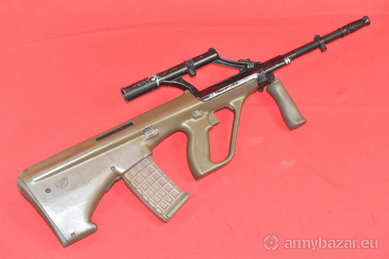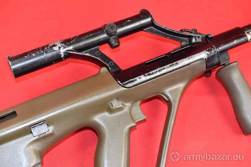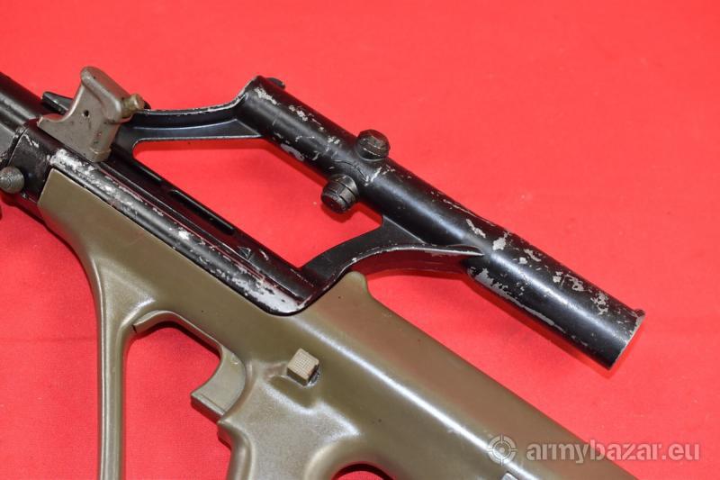 Opis: #7385 Karabinek Steyr AUG A1 kal. 223Rem. Produkcja malezyjska (SME) z lat dziewięćdziesiątych - na licencji austriackiej firmy Steyr. Stan - bardzo dobry. Więcej noszone, niż strzelane - dlatego stan "organów wewnętrznych" jest po prostu świetny. Na elementach metalowych obecna czarna, fabryczna farba. Obecnie w pewnej części wytarta (głównie z obudowy celownika optycznego - który służył często za uchwyt). Trwałość tej farby była bardzo krótka. Brak rdzy czy rdzawego nalotu - nigdy czegoś takiego tutaj nie było. Przewód lufy w stanie idealnym. BROŃ DOWOZIMY NA TERENIE CAŁEGO KRAJU - RAZ W MIESIĄCU