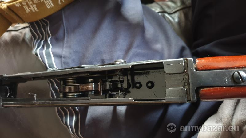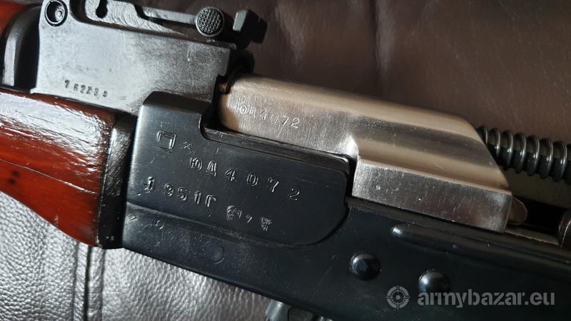 Opis: Karabinek AK typu pierwszego z tłoczoną komorą zamkową. Stan bardzo dobry, zgodny numerycznie także z bagnetem. Trzy magazynki metalowe pierwszego typu. Pas nośny i ładownica z lat 80, radzieckie. Przybornik i olejarka. Do tego ok półtorej konserwy amunicji M43
