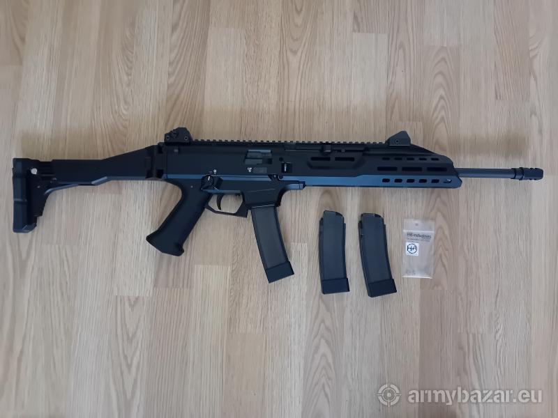 Opis: Karabinek PCC CZ SCORPION EVO3 S1 Carbine kal. 9×19. Stan techniczny i wizualny - jak nowy, symboliczny przebieg ok. 200 kulek. Kupiłem bo mi się podobał, jednak po kilku latach skończyło się miejsce w szafie. Spust poprawiony przez rusznikarza, w porównaniu do fabrycznego jest po prostu rewelacyjny, nie tak twardy i chropowaty jak fabryczny i nie za miękki. Oprócz zestawu fabrycznego (karabinek + dwa 20 nb. magazynki) dołączam magazynek 30 nb. oraz sprężynki spustu HB Industries. Nie montowałem ich ze względu na wspomnianą poprawę rusznikarską, po prostu uznałem że nie ma takiej potrzeby.
