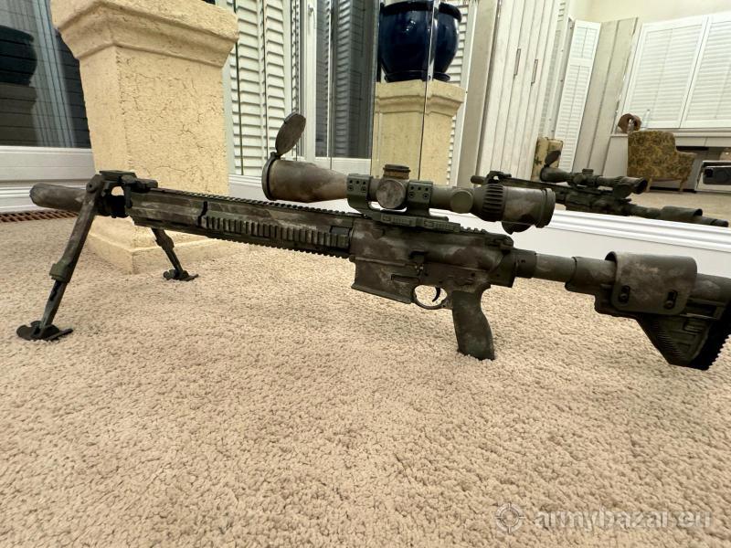 Opis: Karabin HK g28 w kalibrze 308 WIN, malowany cerakote, w zestawie Bipod, dwa tłumiki, luneta Schmidt&Bender 3-27x56 PM II High Power z siatką MSR2, używany kilkukrotnie