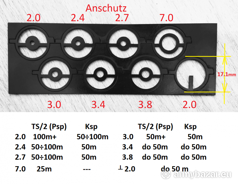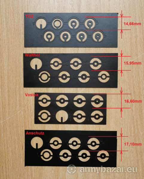 Opis: Inserty do much tunelowych występujących w rozmiarach dla karabinków sportowych Anschutz/Suhl(17,1mm), Walther(16mm) lub TOZ (14.66mm), czy Vostok (16.6mm). Sprzedaż dotyczy 1 kompletu z wybranego wzoru. Inserty wykonane są z wysokogatunkowej stali węglowej wycinanej laserowo i czernione oksydą na gorąco co daje znakomite parametry optyczne i mechaniczne. Tak wykonane inserty ze stali o profilowanej grubości są bardzo odporne i trwałe (nie tak jak te wykonane z cienkich blaszek), a ich rozmiary dobrane do popularnych dystansów strzeleckich i rozmiarów tarcz od szkoleniowych do wyczynowych (TS/2 i Ksp). Dla zaintrygowanych "starym" ogłoszeniem - ono jest aktualne.