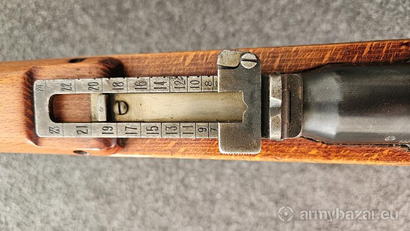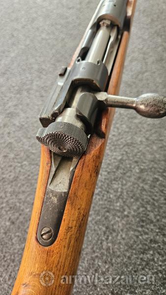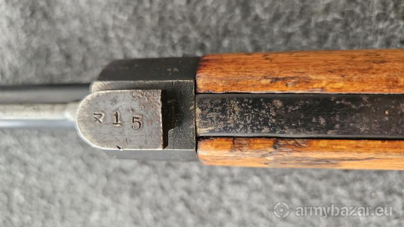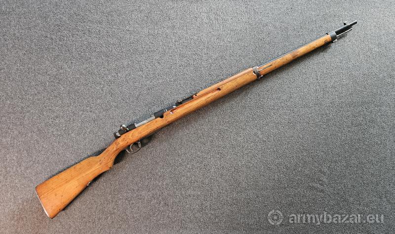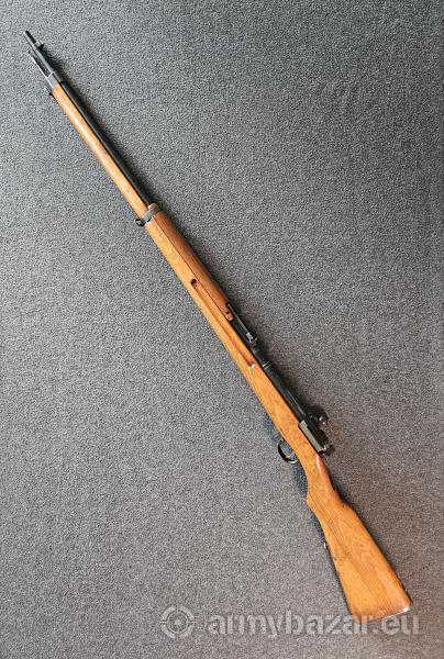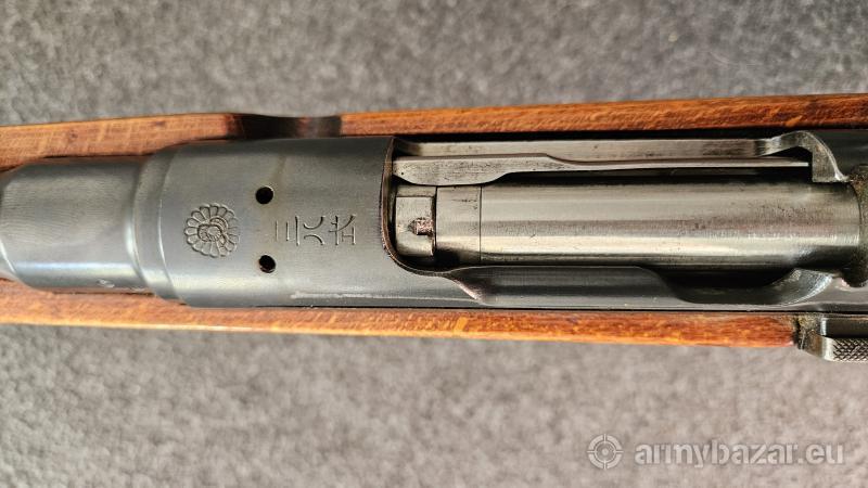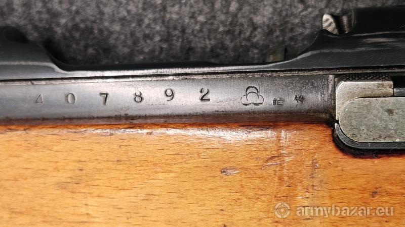 Opis: Karabin Arisaka type38 kal.6,5 jap wyprodukowany w arsenale Koishikawa w Tokio. egzemplarz przedwojenny w oryginalnym stanie zachowania, z lekką patyną. brak jakichkolwiek niefabrycznych dobić i stempli, poza okółkowaną chryzantemą (ale tak mają wszystkie egzemplarze wycofane ze służby przez Japończyków) karabin zgodny numerycznie, tzn. numer seryjny jest tylko na komorze, ale oznaczenia fabryczne z arsenału są zgodne na innych częściach... przewód lufy w stanie dobrym gwint ostry zmatowiony. tel.605200538