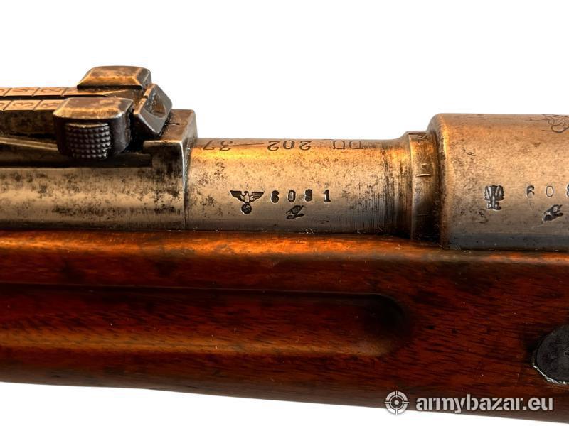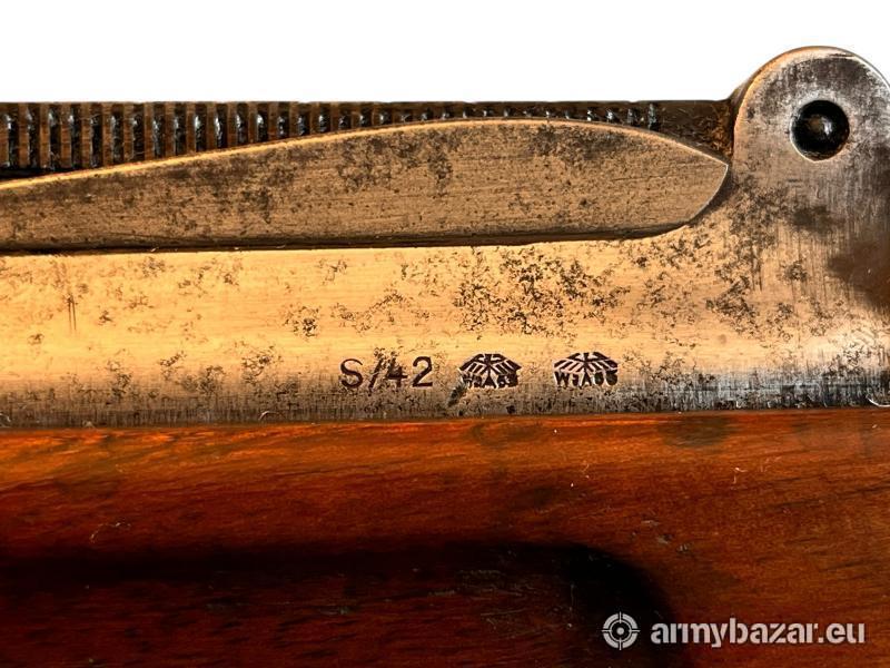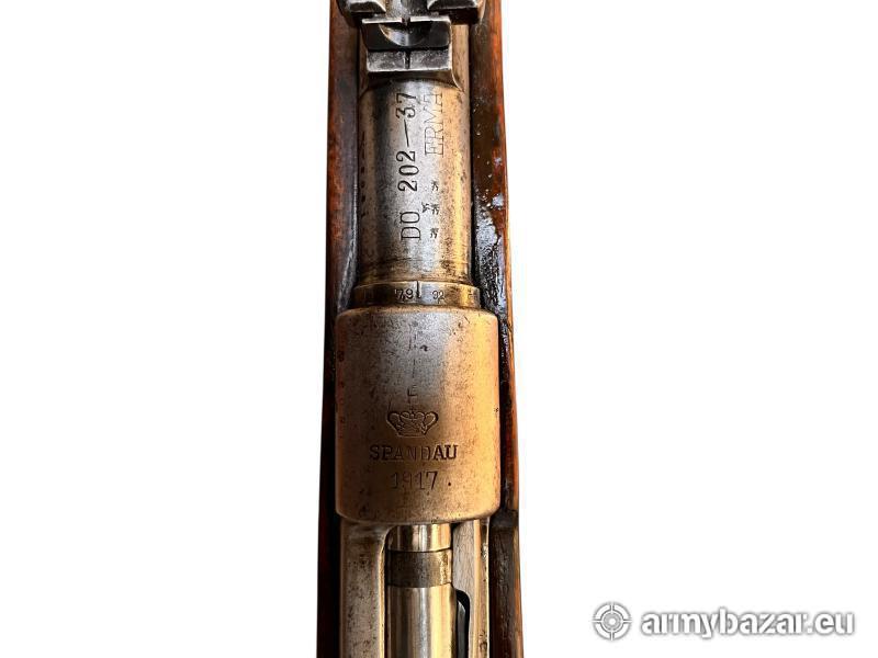Opis: Niemiecki karabin Gewehr 98, wyprodukowany w Królewskim Arsenale Spandau w 1917 roku, będący pełnowymiarową wersją Gew.98 z okresu I wojny światowej (nie K98k). Egzemplarz ten był później przebudowany i ponownie odebrany wojskowo w latach 30., co potwierdza oznaczenie S/42 (Mauser Oberndorf), łącząc w sobie historię Cesarstwa Niemieckiego oraz III Rzeszy. Karabin niezgodny numerycznie – lufa i komora zamkowa posiadają ten sam numer, pozostałe elementy inne, co jest typowe dla egzemplarzy po remontach arsenalskich. Zachowane oryginalne bicia cesarskie, wojskowe Waffenamt oraz oznaczenia arsenalowe, potwierdzające autentyczną służbę wojskową. Broń można obejrzeć w Fortguns. Kontakt: 666366361