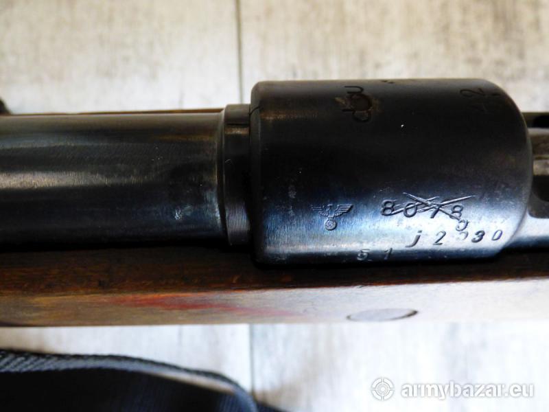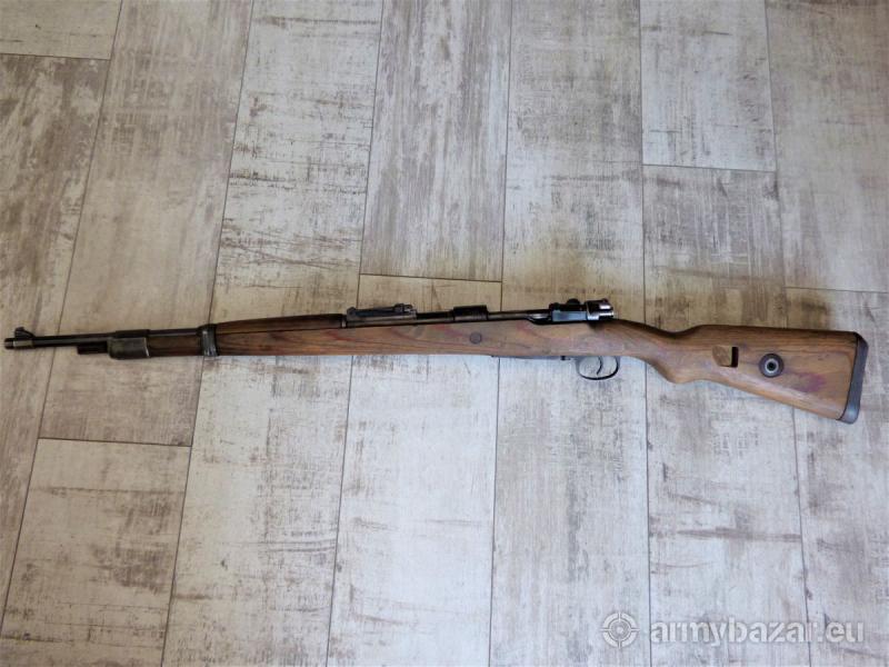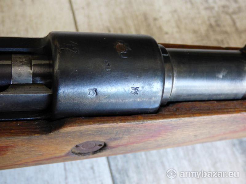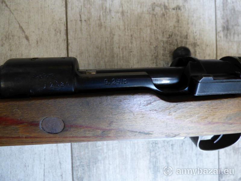 Opis: Karabin Mauser 98 z roku 1942 Mauser 98K z oznaczeniem roku produkcji 1942. Broń wyprodukowana w Czechosłowacji, w Waffenwerke Bruenn w Bystricy. Widoczne znaki odbiorów technicznych. Karabin z oznaczeniem typu: G.24(t) z charakterystyczną prostą dźwignią do przeładowania. Stan ogólny broni – dobry. Przewód lufy z wyraźną bruzdą, w stanie, który można określić jako dobry do bardzo dobrego. Kolba ze sklejki z kompletnymi okuciami. Drewno w dobrym stanie. Kolba prawdopodobnie z tej samej fabryki, co system. Karabin w pełni sprawny. Numer broni: 2530