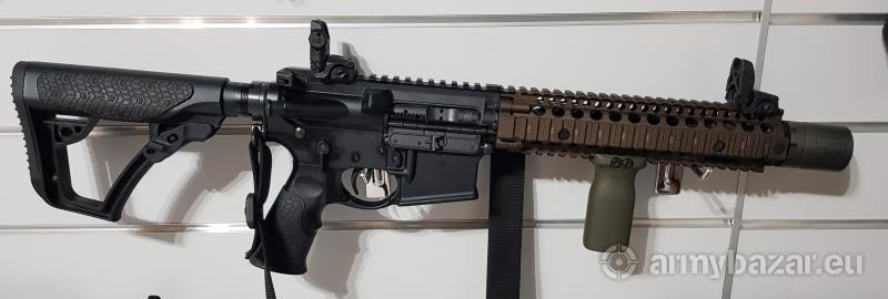 Opis: Wersja demo, powystawowa, - Karabinek Daniel Defense DD MK18 - Chwyt przedni Magpul RVG Grip BLK - Kompensator Ferfrans - Obustronna dźwignia przeładowania - Spust Geissele (SSP) Super Speed Precision Dynamic Flat Blow - Powiększony zrzut zamka AR Geissele - muszka i szcerbina mbus