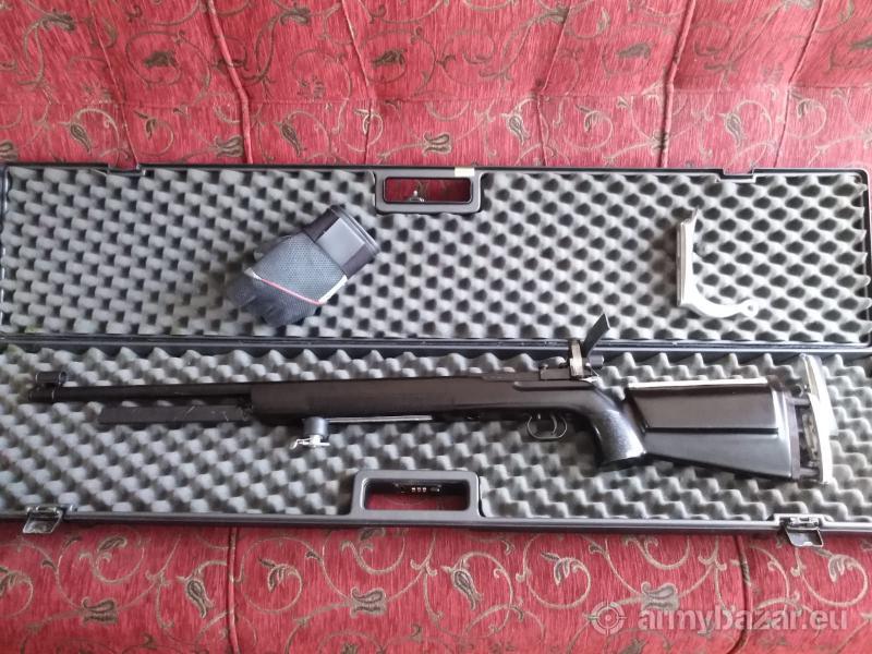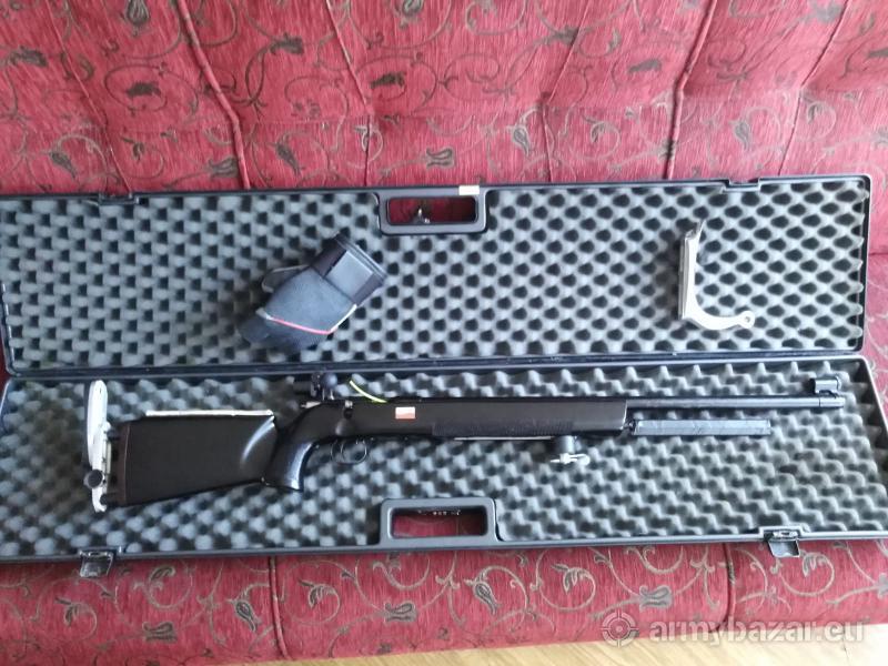 Opis: Wybierany z kilkunastu sztuk, przejrzany i odnowiony, całkowicie sprawny i bardzo celny, z kilkoma modyfikacjami (polerowany zamek, gumowa kulka na rączce zamka, obciążnik z przodu łoża, dołożona baka, przedłużana kolba, stopka z możliwością lekkiego odchylenia od pionu) + kilka dodatków dla zdecydowanego kupca: handstop z zaczepem, redukcja pod blendę Gehmann/Anschutz, zestaw insertów przezroczystych do muszki tunelowej, stopka z hakiem. Kufer widoczny na zdjęciu nie jest na sprzedaż.