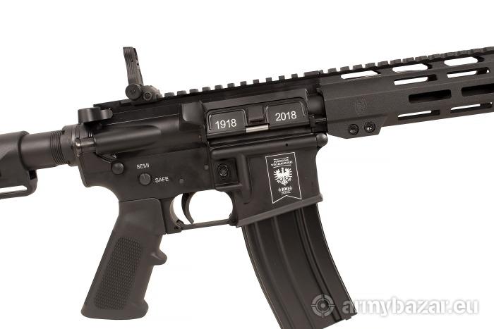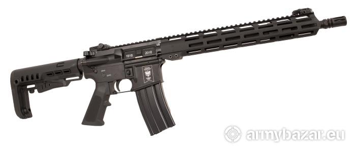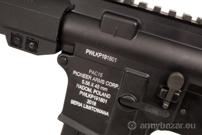 Opis: Nowoczesny karabinek samopowtarzalny PAC15 w kalibrze 5.56 x 45 mm, będący produkowaną w Polsce wersją systemu AR15 przeznaczoną na rynek cywilny. Egzemplarz z limitowanej edycji PWLKP powstałej z okazji 100. rocznicy wybuchu Powstania Wielkopolskiego. W jej ramach powstało 18 sztuk karabinków: dziewięć w wersji z lufami 14,5" oraz dziewięć z lufami 16". W serii limitowanej karabinki otrzymały: - na prawej stronie komory spustowej grafikę upamiętniającą 100. rocznicę wybuchu Powstania Wielkopolskiego - na klapce okna wyrzutnika daty 1918 oraz 2018 - po lewej stronie komory spustowej napis SERIA LIMITOWANA oraz numer PWLKP1918 od 01 do 18.