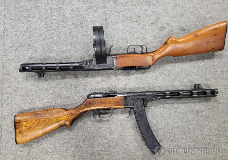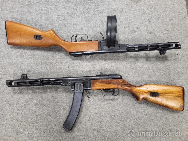 Opis: Posiadamy na sprzedaż 5 sztuk. Kaliber 7,62x25mm. Produkcja ZSRR. Broń zgodna numerycznie. W zestawie do każdej magazynek bębnowy, magazynek łukowy, oliwiarka, ładownice. Broń z roczników 1945. Widać, że broń była robiona w warunkach wojennych, niektóre egzemplarze posiadają krzywo zamontowane przyrządy celownicze, dodaje to im klimatu. Super broń do twojej kolekcji!
