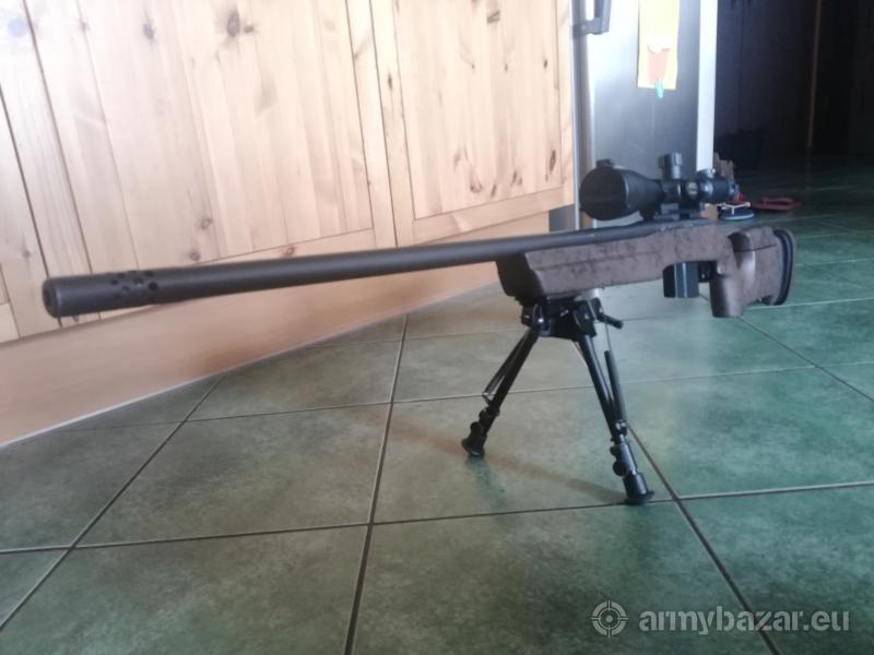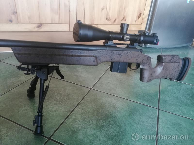 Opis: 308 WiN, osada Bell and Carlson, spust Jard, magazynek metalowy z obsadą Wayatt, lufa nagwintowana na końcu. Luneta DO 4,5-30 :50,siatkaMCZ 01.Szyna pochylona20 moa. Hamulec wylotowy.Bipod Harris L, kufer i oryginalne graty - osada, spust, w zestawie.