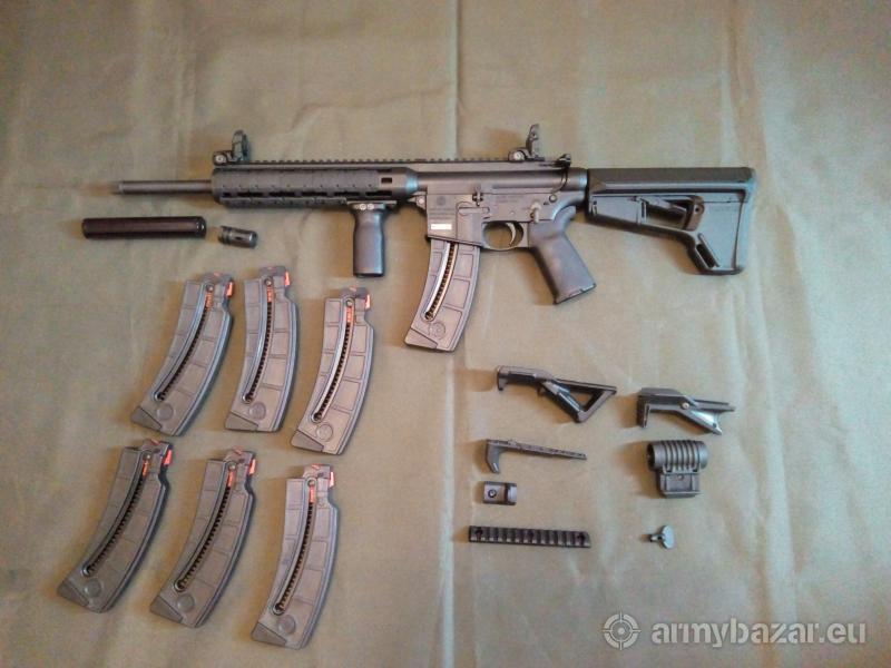 Opis: Karabinek Semi-auto w kalibrze 22 lr w stanie idealnym niezawodny i celny pelna kompatybilnosc z czesciami od ar-15 takimi jak spust sprezyny chwyt oraz kolba W zestawie :kolba Magpull acs ,chwyt magpull ,zaslepki szyny mlok ,tłumik do 22 lr na gwint 1/2x28 cena z 6 dodatkowymi magazynkami 4600 cena bez magazynków 3750