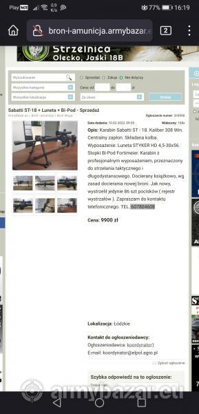 Opis: Zalecam ostrożność w przypadku ogłoszenia http://bron-i-amunicja.armybazar.eu/pl/bron-dluga/sabatti-st-18-luneta-bi-pod-id205331/ W czwartek 10/02/2022 po kontakcie telefonicznym umówiłem się na wpłatę zaliczki i odbiór broni dnia następnego. Broń ta była wystawiona za 9500. Wpłaciłem 2000 zaliczki. Dzień później wyjechałem z Rzeszowa do Łodzi, by zgodnie z umową odebrać broń. Pomimo wielu prób kontaktu (odrzucane połączenie itp) nie udało się spotkać, wróciłem z niczym. Dzień później jakieś bzdurne gadki i groźby. Sądzę, że broń i osoba istnieją, ale człowiek jest niepoważny. Zwrotu zaliczki wciąż nie otrzymałem. Więcej szczegółów mogę podać 69trzy067452.