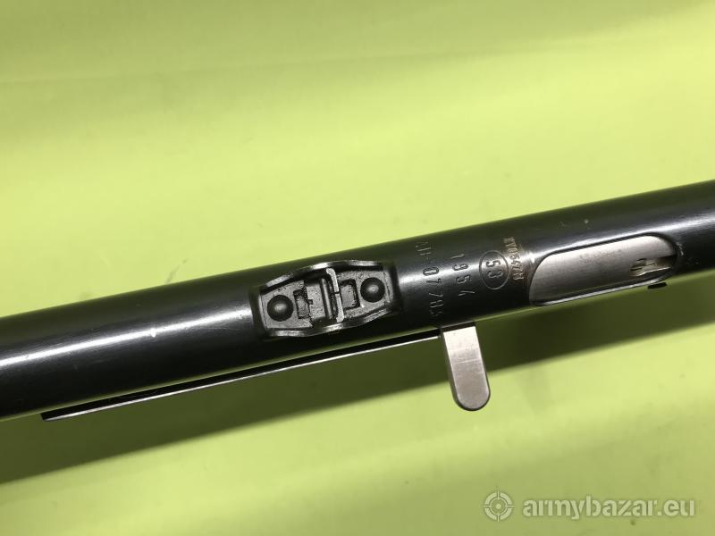 Opis: Egzemplarz w stanie bardzo dobrym, prawdopodobnie przeszedł remont o czym świadczyć może dodatkowe oznaczenie naniesione powyżej kodu numerycznego zakładów Wifama. Od spodu naniesione zostało oznaczenie AMW PL. Lufa nowa, w stanie idealnym. W komplecie pełne ukompletowanie, tj. ładownica, 4 magazynki, pas oraz wycior. Broń przerabiamy z maksymalnym poszanowaniem walorów kolekcjonerskich - obecne są wyłącznie fabryczne oznaczenia. Strzela jak w oryginale - z zamka otwartego. Więcej zdjęć na: www.fmjspj.pl