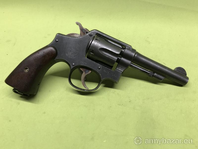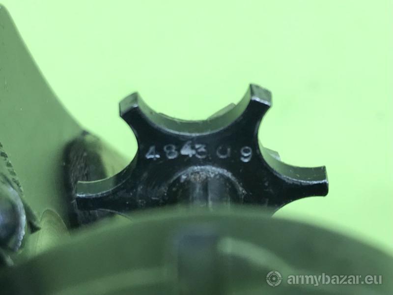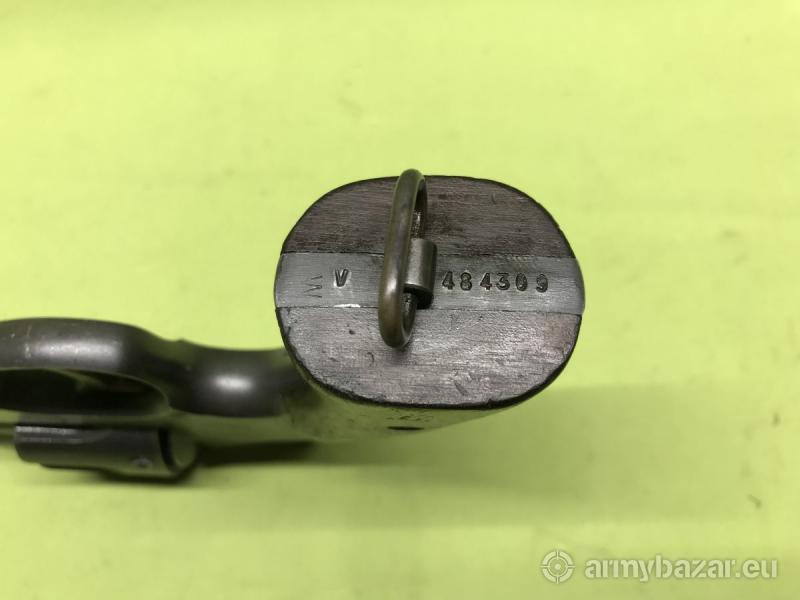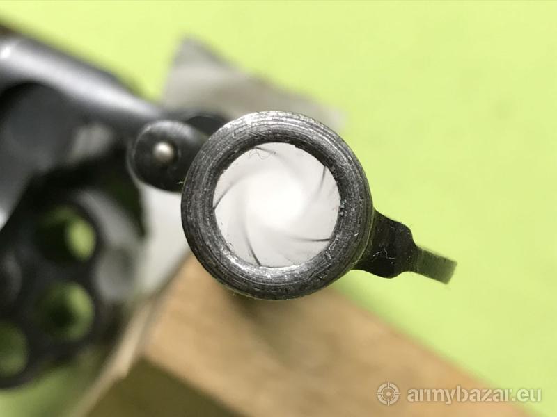 Opis: Broń posiada oryginalną fosfatowaną powłokę tzw. Black Magick finish oraz fabryczne okładziny chwytu, wykonane z orzecha amerykańskiego. Wszystkie części, które były numerowane, tj. szkielet, lufa, bęben, wyłuskiwacz oraz prawa okładzina chwytu są zgodne numerycznie. Ponadto numer montażowy na szkielecie i mechanizmie otwierania bębna jest taki sam. Obecne są odbiory "P" na właściwych elementach - szkielecie, lufie oraz bębnie. Lufa oraz komory bębna są w stanie idealnym. Z lewej strony szkieletu widać przefrezowanie - prawdopodobnie znajdowało się tam oznaczenie jednostki policji, na której stan przyjęto ten egzemplarz, np. "BAVARIA MUNICIPAL POLICE"