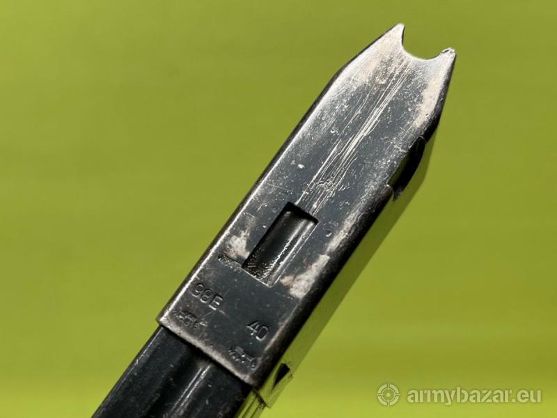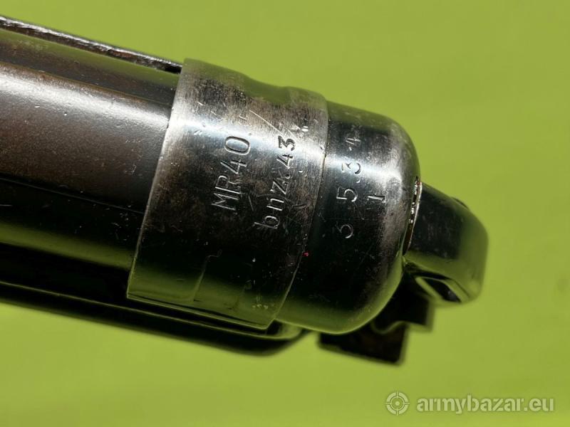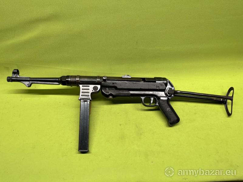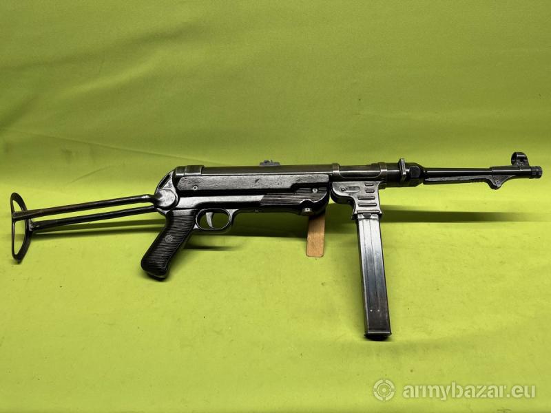 Opis: Pistolet samoczynny MP-40 w kalibrze 9x19mm. Egzemplarz wyprodukowany w 1943r. w zakładach Steyr-Daimler-Puch. Po zakończeniu II Wojny Światowej znalazł się na wyposażeniu Armii Jugosłowiańskiej, a następnie po rozpadzie Jugosławii - w magazynach słoweńskich.Oferowany egzemplarz znajduje się w stanie bardzo dobrym. Lufa w stanie idealnym - lustro, co jest nie jest częste wśród tych pistoletów ze względu na fakt, iż mają za sobą co najmniej dwie wojny. W komplecie znajduje się jeden oryginalny magazynek. Broń aktualnie w ogniu samoczynnym, na życzenie kupującego istnieje możliwość przerobienia na ogień samopowtarzalny, w cenie.