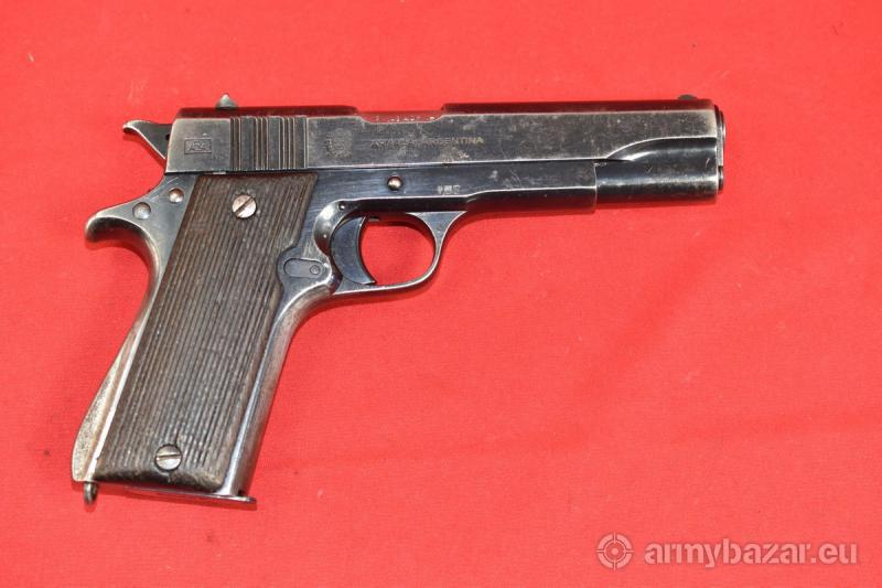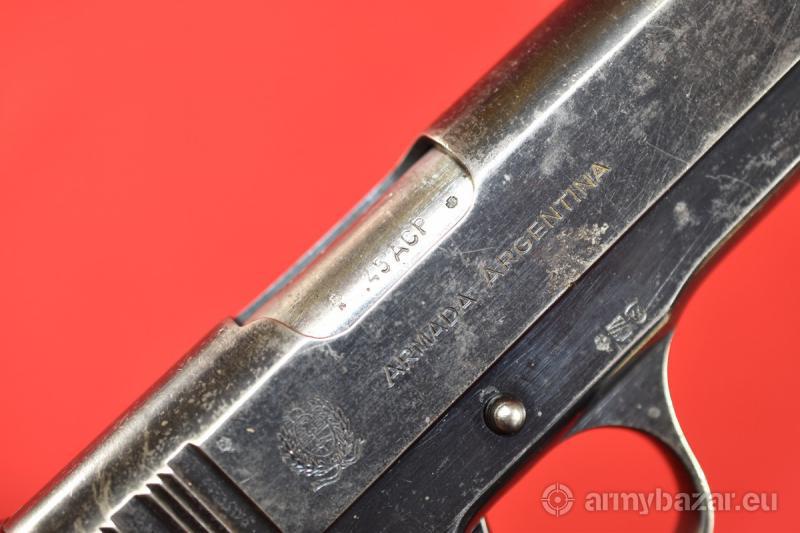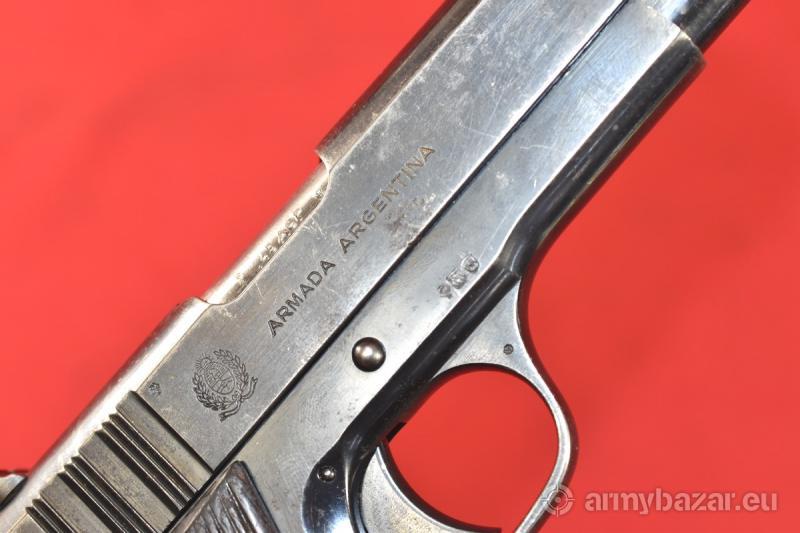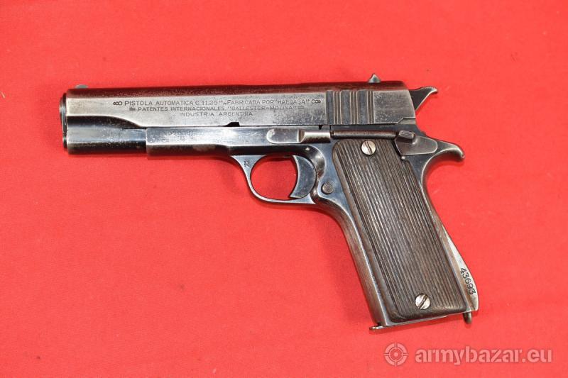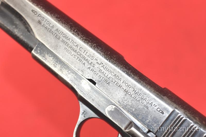 Opis: #7503 Pistolet Ballester Molina kal. 45ACP. Jest to licencyjna produkcja argentyńska amerykańskiego Colta M1911 przeznaczona dla armii oraz policji argentyńskiej. Oficjalna nazwa, pod jaką wprowadzono go do uzbrojenia, to Pistola Automatica Calibre .45 Ballester-Rigaud, Modelo DGME 1938. Numer seryjny wskazuje na produkcję z roku 1946. Przewód lufy: używany, w niektórych miejscach zmatowiony - ogólnie w całości jasny i czysty. Gwint ostry i kompletny. W początkowym odcinku widać drobne wżery. BROŃ DOWOZIMY NA TERENIE CAŁEGO KRAJU - RAZ W MIESIĄCU