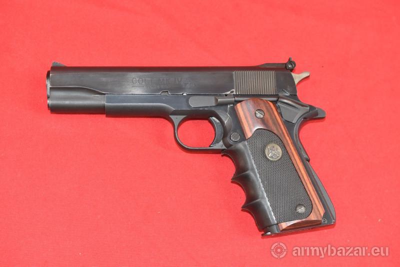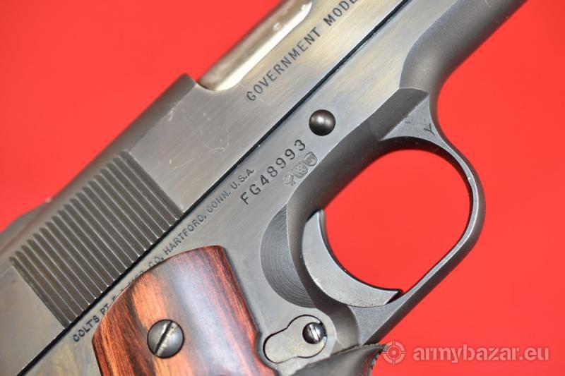 Opis: #7601 Pistolet Colt MKIV SERIES'80 Government Model. Kaliber 9x19. Model produkowany od roku 1983. Oferowany tutaj egzemplarz posiada atest nitro z roku 1987. Regulowana mikrometrycznie szczerbinka, magazynek o pojemności 7 naboi. Stan bardzo dobry, pistolet wykazuje drobne ślady niezbyt intensywnej eksploatacji. W rejonie zatrzasku zamkowego obecne są zadrapania od rozbierania broni. Sprawdzony i wypróbowany przez rusznikarza. Przewód lufy: fabryczny. BROŃ DOWOZIMY NA TERENIE CAŁEGO KRAJU - RAZ W MIESIĄCU
