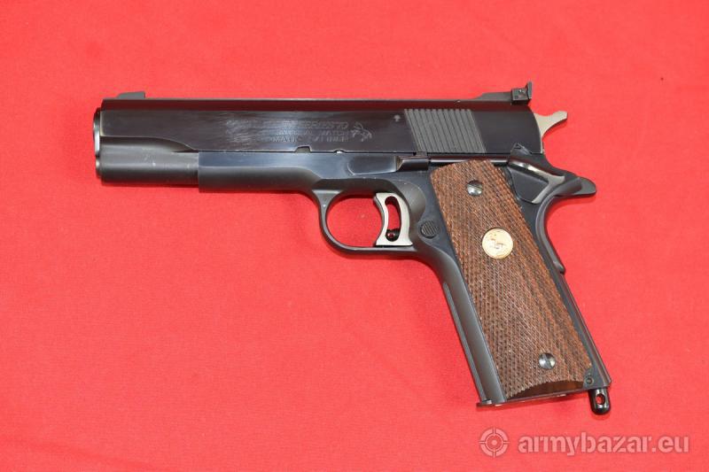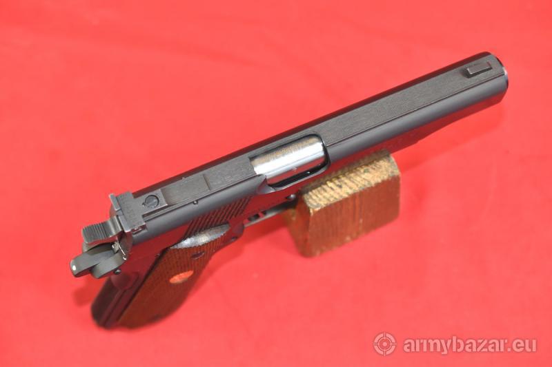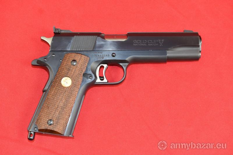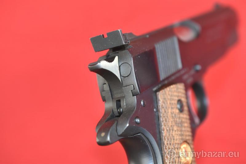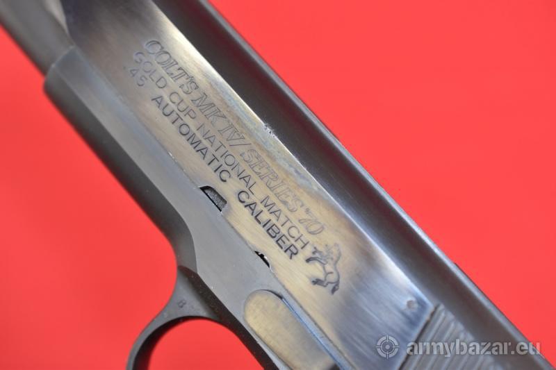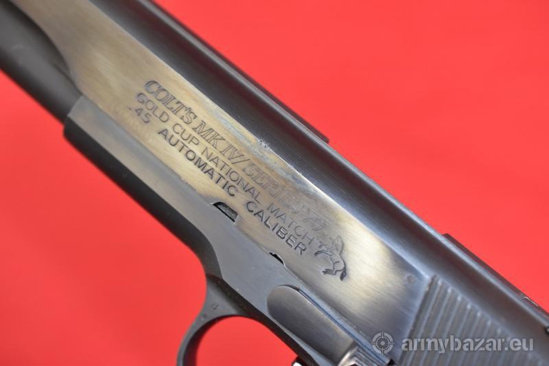 Opis: #7603 Pistolet Colt MKIV SERIES'70 Gold Cup National Match. Kaliber 45ACP. Model produkowany w latach 1970-1983. Oferowany tutaj egzemplarz posiada atest nitro z roku 1981. Regulowany, matchowy mechanizm spustowy z poszerzonym językiem oraz regulowane mikrometrycznie przyrządy celownicze Elliason. Stan bardzo dobry, pistolet wykazuje drobne ślady niezbyt intensywnej eksploatacji. Jedyna wada, mająca znaczenie wyłącznie kosmetyczne, to ślad po minimalnym wżerze na zamku, powyżej napisu po lewej stronie. Ktoś próbował go zamaskować oksydą na zimno. Przewód lufy: fabryczny. BROŃ DOWOZIMY NA TERENIE CAŁEGO KRAJU - RAZ W MIESIĄCU