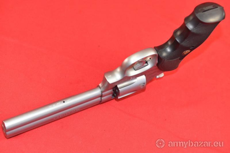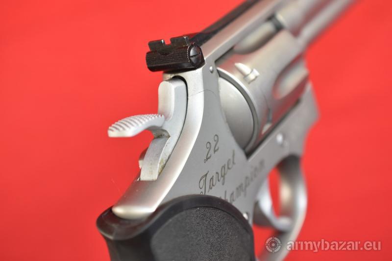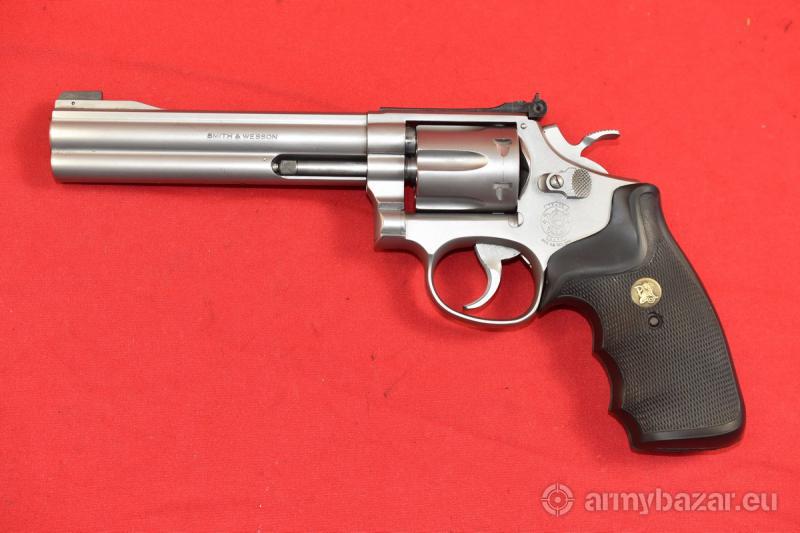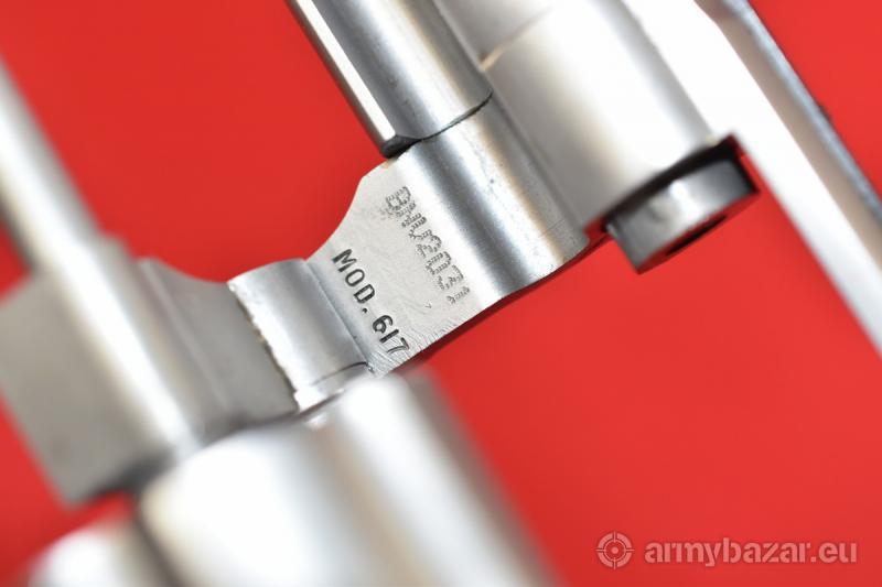 Opis: #7676 Rewolwer sportowy bocznego zapłonu Smith & Wesson Mod. 617 Target Champion kal. 22lr. Model 617 produkowany był w latach 1989-1993. Wykazuje ślady normalnej, kulturalnej eksploatacji. Stal nierdzewna wykończona matowo. Nic nie kombinowane, nic nie modyfikowane, nic nie naprawiane, nic nie uszkodzone. System SA/DA, bębenek sześcionabojowy, długość lufy 6 cali. Amerykańska gumowa okładzina firmy Pachmayr. Sprawdzony i wypróbowany przez rusznikarza. Przewód lufy: w stanie fabrycznym. BROŃ DOWOZIMY NA TERENIE CAŁEGO KRAJU - RAZ W MIESIĄCU