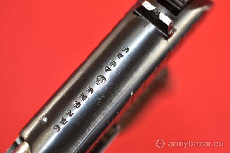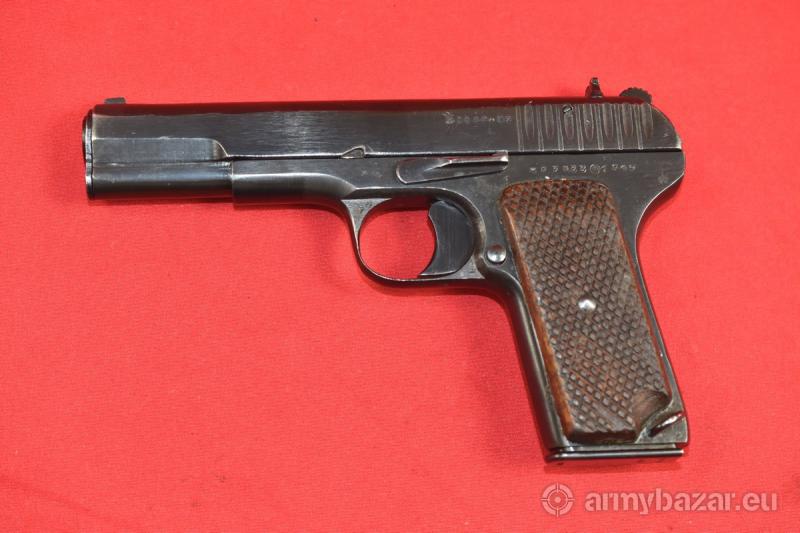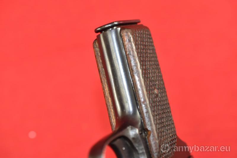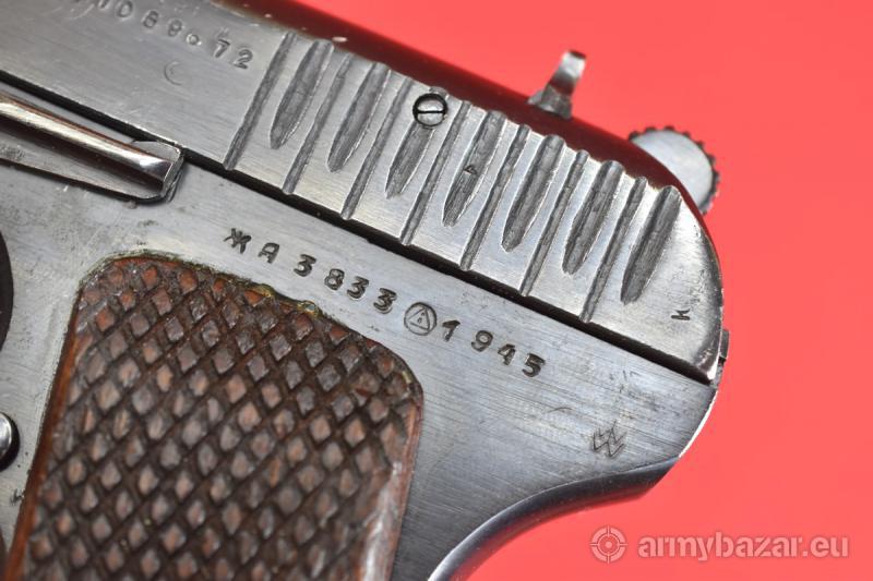 Opis: #7695 Pistolet TT-33 kal. 7,62x25. Produkcja zakładów w Iżewsku z roku 1945. Egzemplarz niezgodny numerycznie. Przeszedł powojenny remont, podczas którego został wtórnie oksydowany. Oprócz stempli fabrycznych, obecne są stemple czeskiego atestu CiP. Przewód lufy: praktycznie idealny. W paru miejscach można dopatrzyć się delikatnych śladów używania. BROŃ DOWOZIMY NA TERENIE CAŁEGO KRAJU - RAZ W MIESIĄCU