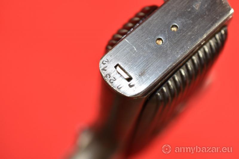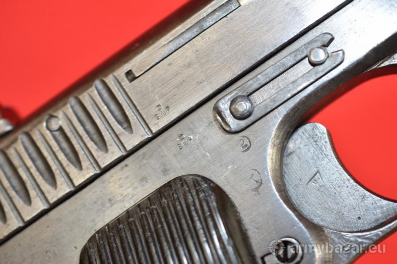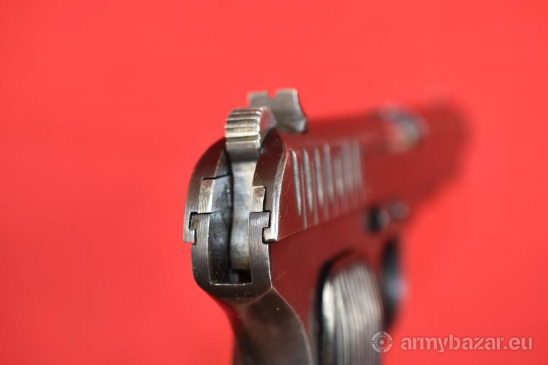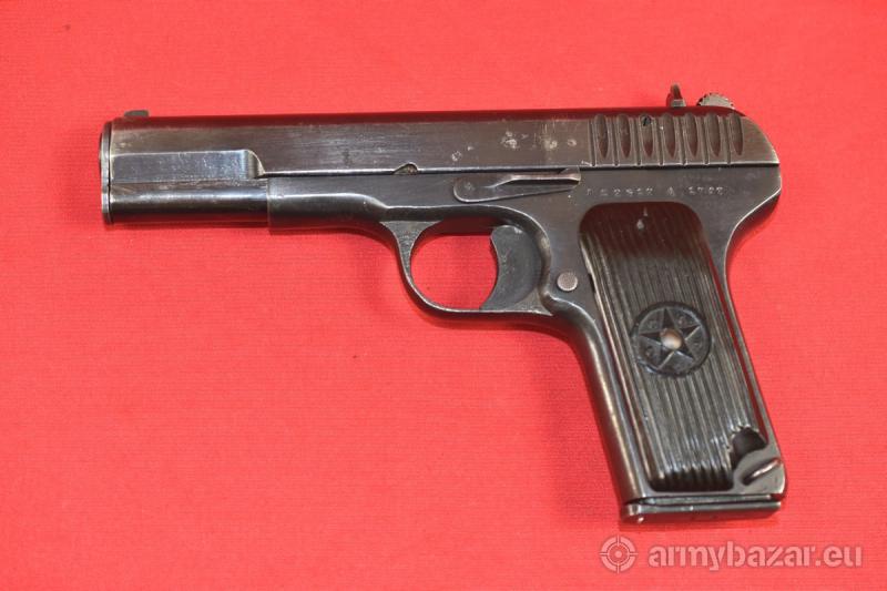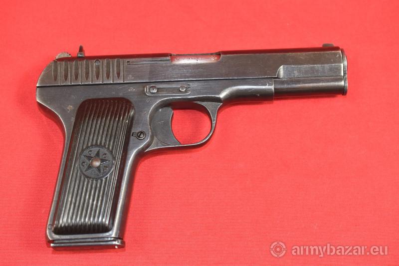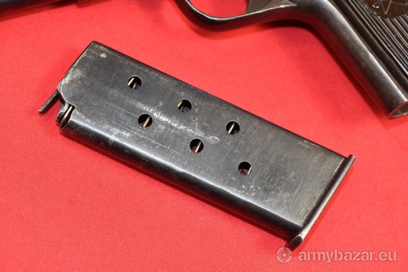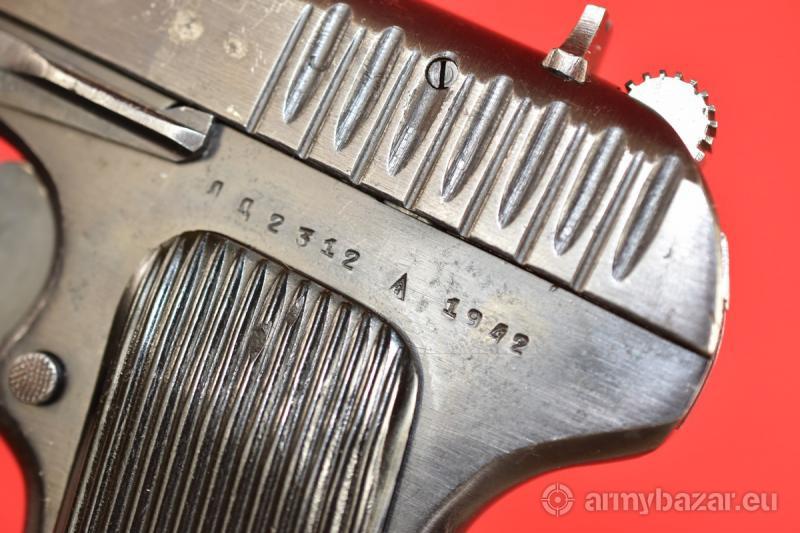 Opis: #7696 Pistolet TT-33 kal. 7,62x25. Produkcja zakładów w Iżewsku z roku 1942. Egzemplarz zgodny numerycznie (łącznie z magazynkiem). TT-33 produkcji wojennej ze zgodnymi magazynkami - występują bardzo rzadko. Oksyda oryginalna, fabryczna. Oprócz stempli fabrycznych, obecne są stemple brytyjskiego atestu CiP - patrz zdjęcia. Pistolet sprawdzony i wypróbowany przez rusznikarza. Przewód lufy: gwint ostry i kompletny na całej długości. Obecne drobne wżery rozsiane po całości. BROŃ DOWOZIMY NA TERENIE CAŁEGO KRAJU - RAZ W MIESIĄCU