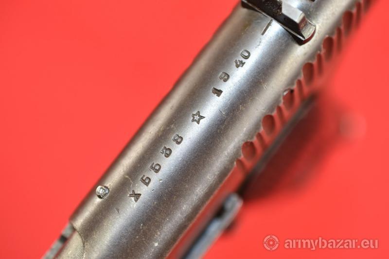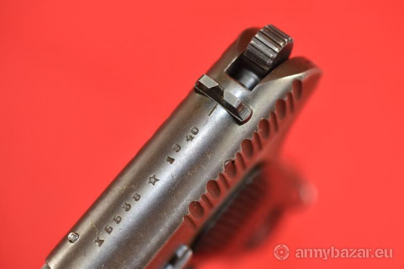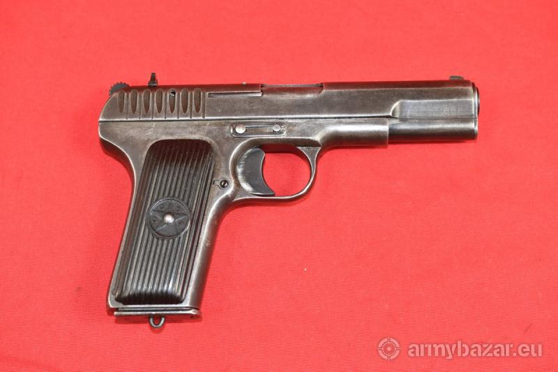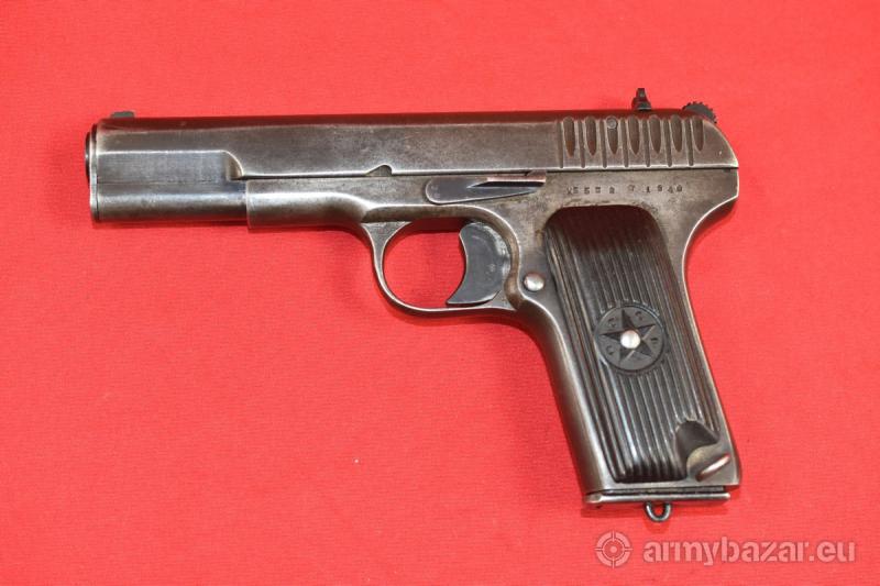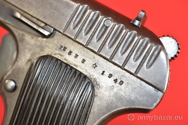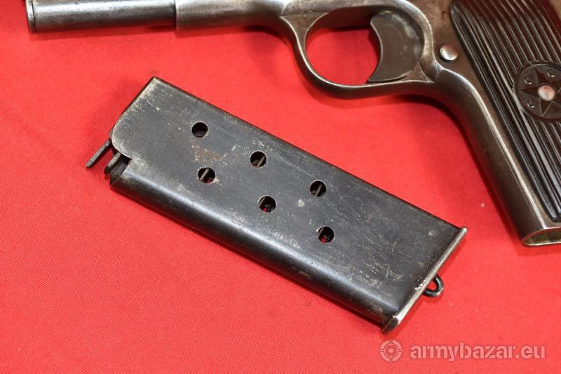 Opis: #7697 Pistolet TT-33 kal. 7,62x25. Produkcja zakładów w Tule z roku 1940. Egzemplarz zgodny numerycznie (oprócz magazynka). Mocno używany, zachowane resztki oryginalnej oksydy. Obecne są tylko stemple fabryczne. Pistolet sprawdzony i wypróbowany przez rusznikarza. Przewód lufy: gwint ostry i kompletny na całej długości. Obecne drobne wżery rozsiane po całości. BROŃ DOWOZIMY NA TERENIE CAŁEGO KRAJU - RAZ W MIESIĄCU