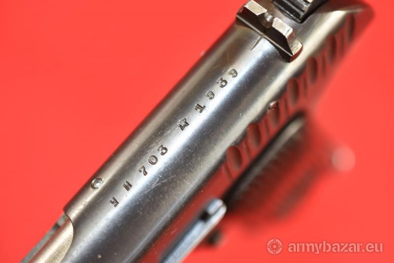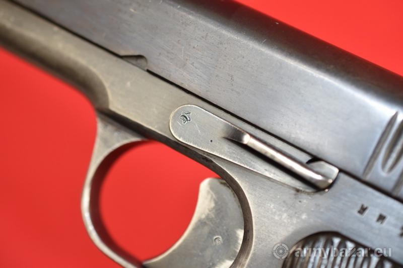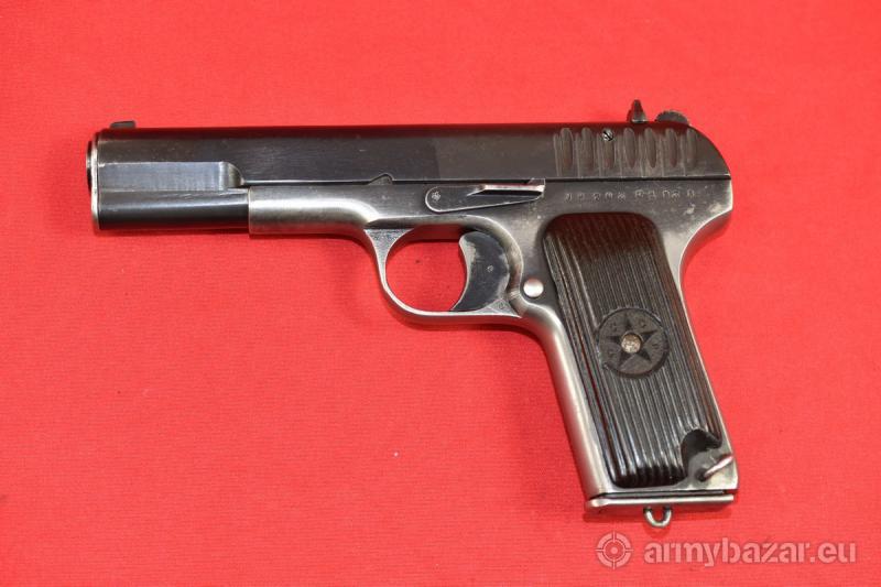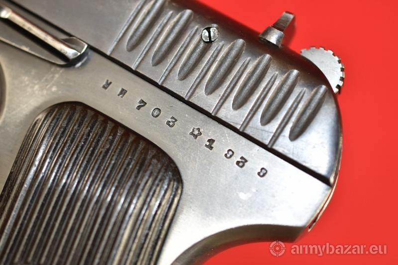Opis: #7698 Pistolet TT-33 kal. 7,62x25. Produkcja zakładów w Tule z roku 1939. Egzemplarz zgodny numerycznie - łącznie z magazynkiem - co w przypadku TT-33 z okresu wojny jest bardzo rzadkie. Obecne są tylko stemple fabryczne. Zachowana oksyda jest fabryczna, oryginalna - jednakże ktoś wpadł na pomysł, by jednak ogólnie "przeczyścić" szkielet - stąd taka różnica w stanie zachowania zamka i szkieletu. Pistolet sprawdzony i wypróbowany przez rusznikarza. Przewód lufy: gwint ostry i kompletny na całej długości. Obecne drobne wżery rozsiane po całości. BROŃ DOWOZIMY NA TERENIE CAŁEGO KRAJU - RAZ W MIESIĄCU