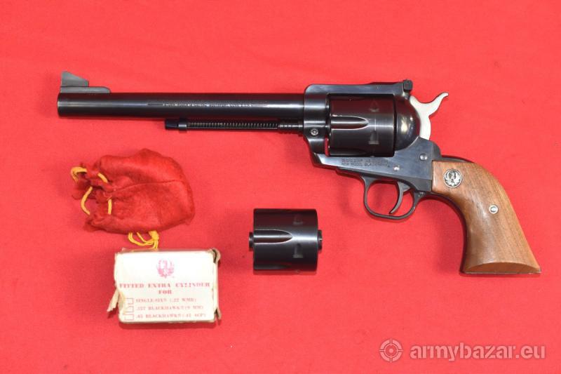 Opis: #7702 Rewolwer Ruger New Model Blackhawk kal. 45 ACP - w komplecie z wymiennym bębnem w kalibrze .45 Long Colt. Bęben wymienny wciąż w fabrycznym pudełku i fabrycznym woreczku. System SA, rok produkcji 1980. Długość całkowita: 34 cm, wysokość 15 cm. Egzemplarz lekko używany, w świetnym stanie. Sprawdzony i wypróbowany przez rusznikarza. Piękna fabryczna oksyda. Przewód lufy: fabryczny. Sprzedaż na jedną promesę. BROŃ DOWOZIMY NA TERENIE CAŁEGO KRAJU - RAZ W MIESIĄCU
