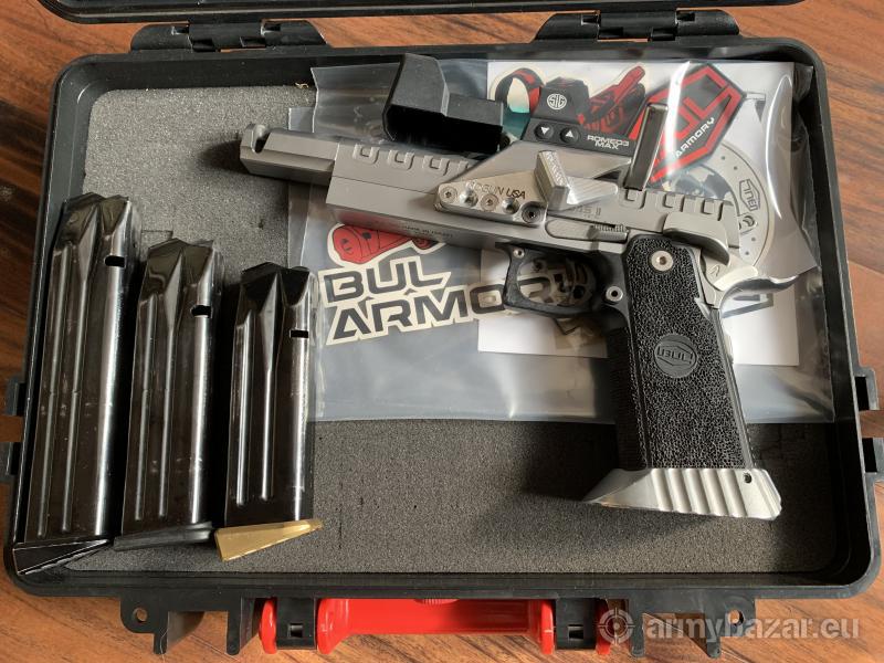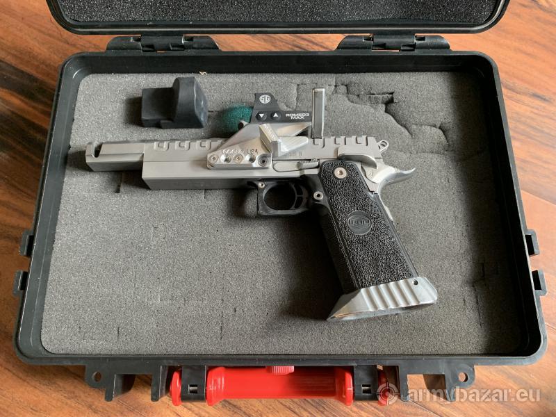 Opis: Pistolet wyczynowy do IPSC dywizji OPEN. Wersja HEAVY METAL została wyposażona w pełną osłonę żerdzi (Full Dust Cover) dla lepszej kontroli odrzutu, umożliwiając szybsze oddawanie kolejnych strzałów. Jestem drugim właścicielem wystrzelałem z niego około 2500 sztuk amunicji, służył jako broń zastępcza. Dołożone do oryginału: ~Kolimator SIG SAUER Romeo 3 MAX ~Thumbrest firmy GoGun ~3 Magazynki Długi, Średni oraz krótki.
