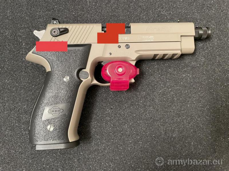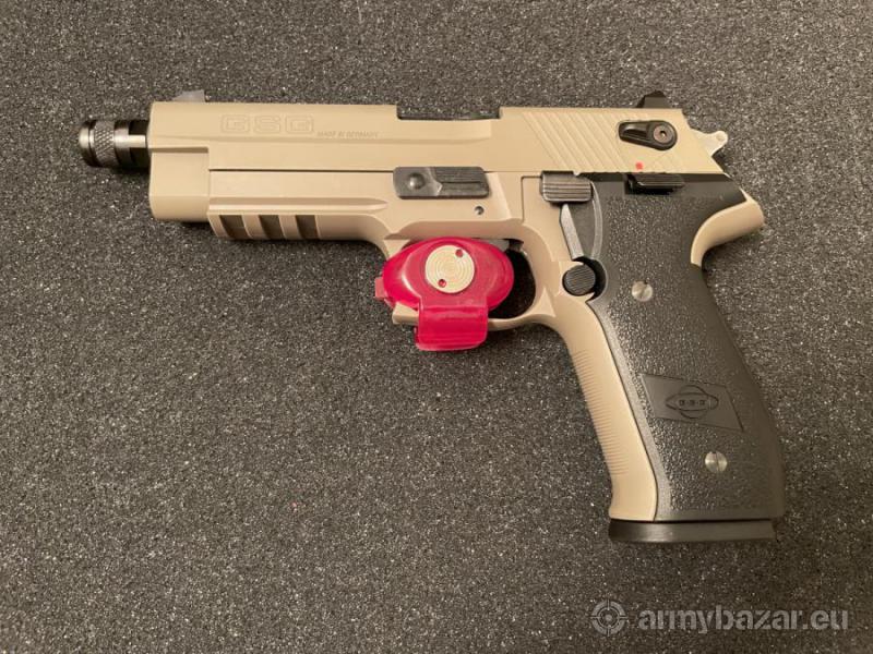Opis: Zupełnie nowy GSG Firefly .22LR półautomat w jasnobrązowym wykończeniu, wyjęty z pudełka tylko po to, aby zainstalować blokadę spustu i do zdjęć. Numery seryjne zamaskowane na czerwono.