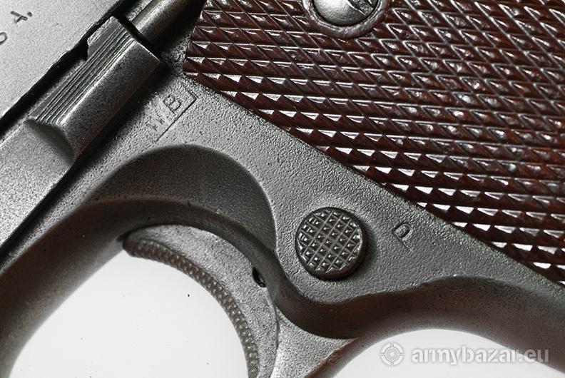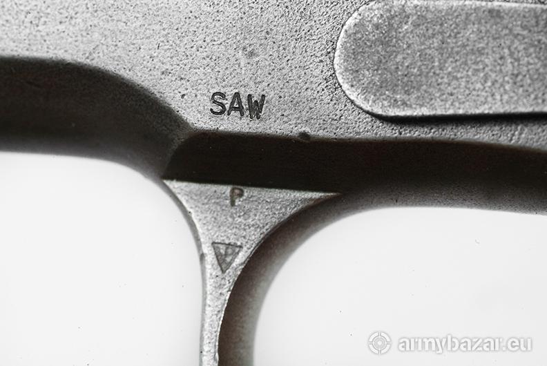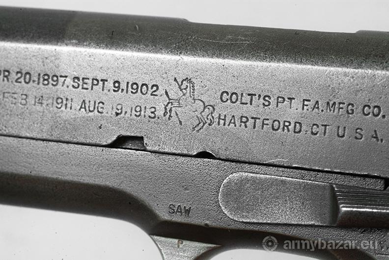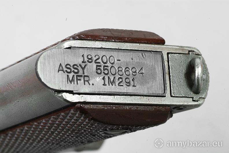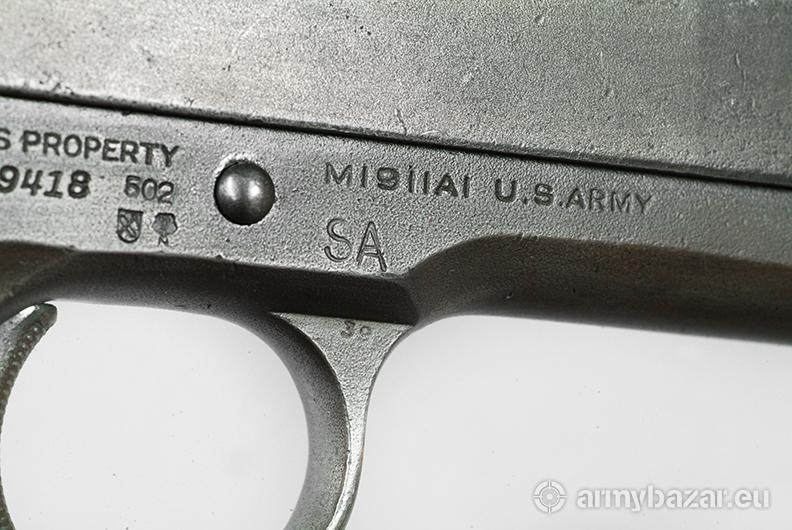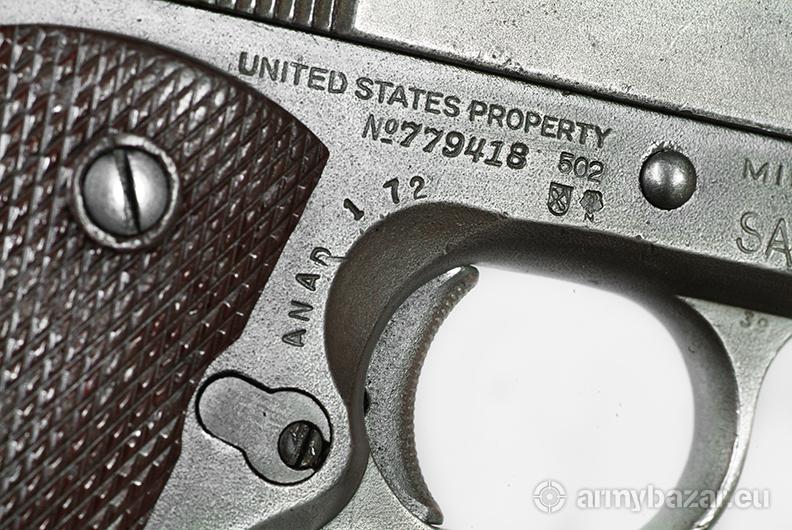 Opis: Colt 1911A1 Wczesna produkcja wojenna z 1942 roku. Broń oznaczona licznymi cyframi i literami. Litery: SA to Springfield Armory, główne warsztaty remontowe podczas II Wojny Światowej i póżniej wojny koreańskiej, działające do lat 50-tych. Oznaczenie ANAD 1 72 to remont w Anniston Army Depot w Alabamie w styczniu 1972 roku na potrzeby wojny wietnamskiej. 502 wybite na szkielecie to być może oznaczenie 502 Pułku Piechoty Spadochronowej. Wygląda na to że broń ta wzięła udział we wszystkich wymienionych wojnach.