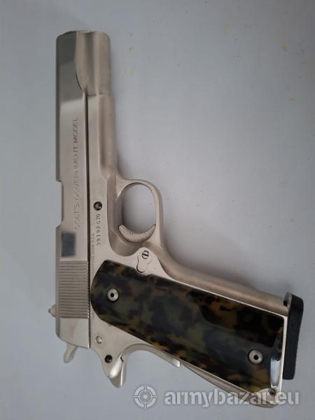 Opis: Colt MK IV Series 70 – klasyczny amerykański pistolet samopowtarzalny w kalibrze .45 ACP, oparty na legendarnej konstrukcji 1911. Produkcja Colt’s Manufacturing Company (USA). Model ceniony za niezawodność, precyzyjny spust oraz brak blokady iglicy, charakterystyczny dla serii 70. Wykończenie w srebrnym kolorze. Rękojeść z korala, nadająca broni unikalny, kolekcjonerski charakter. Kaliber: .45 ACP Mechanizm: Single Action Pojemność magazynka: 7 nabojów Konstrukcja: stalowa rama i zamek Stan bardzo dobry. Atrakcyjny egzemplarz kolekcjonerski, odpowiedni zarówno do kolekcji, jak i strzelania rekreacyjnego.