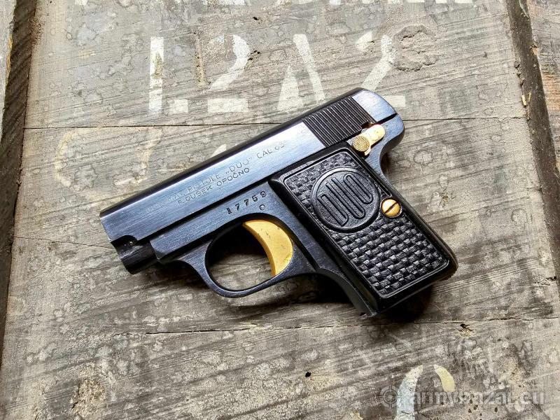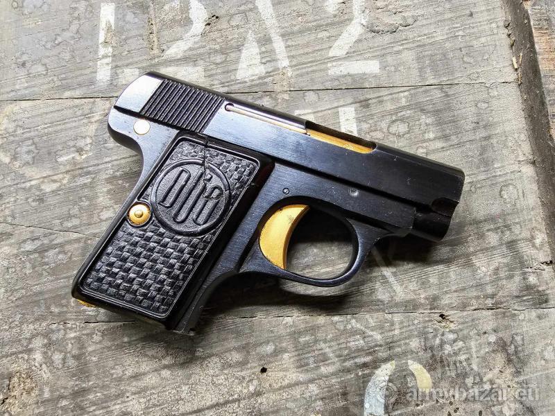 Opis: Kieszonkowy pistolet CZ DUO w kalibrze 6,35mm Browning. Mała i zgrabna konstrukcja produkcji Czeskiej Zbrojovki. Produkowany od lat 30' w Czechosłowacji, bywał osobistym wyborem niemieckich oficerów podczas II wojny, oraz na rynku cywilnym. Ciekawa wersja prezentowa ze spustem, lufą oraz bezpiecznikiem w kolorze złotym. Delikatnie pęknięta, sklejona okładzina. MOŻLIWOŚĆ DOWOZU
