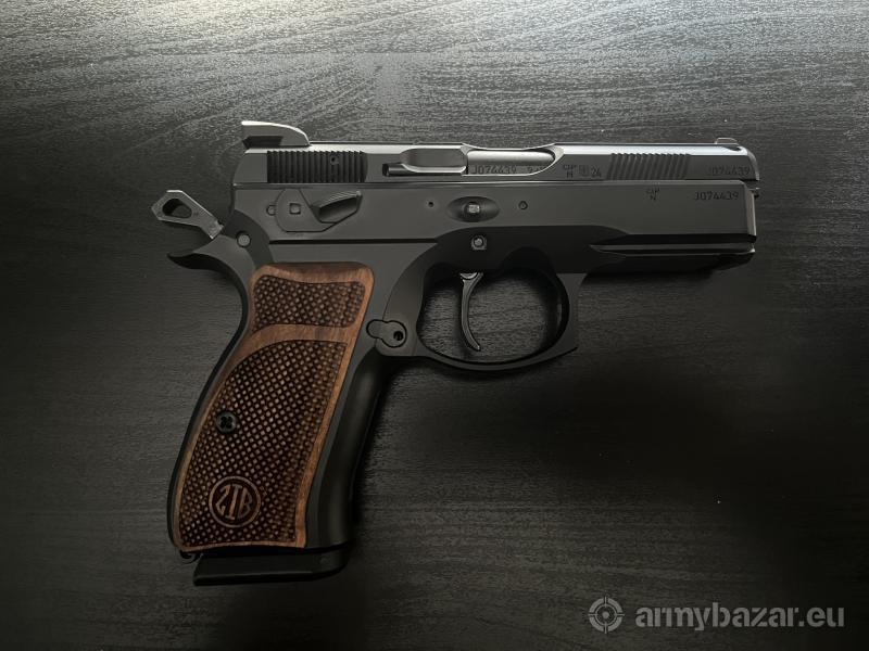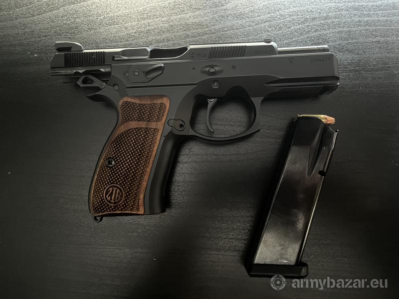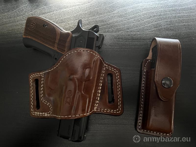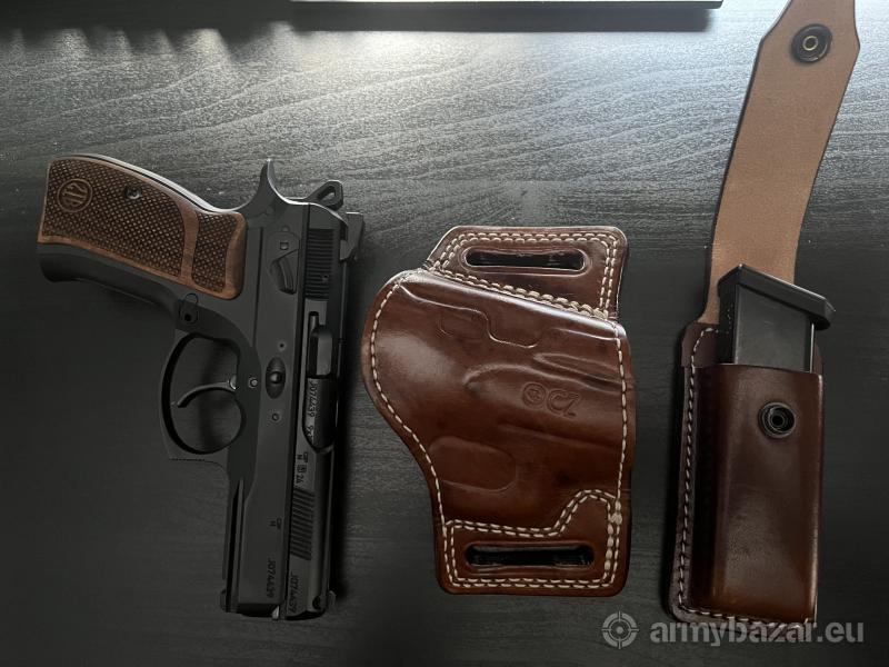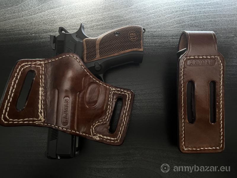 Opis: Witam, sprzedam CZ P-01 Omega 9x19 mm zakupioną w sierpniu tego roku. Przestrzelane 9 paczek amunicji. Pistolet w idealnym stanie, zmienione zostały okładziny chwytu na drewniane sprowadzone z USA, wykonane z drewna bukowego. W zestaw wchodzi brązowa skórzana kabura z firmy Kajman oraz jedna również brązowa skórzana ładownica.