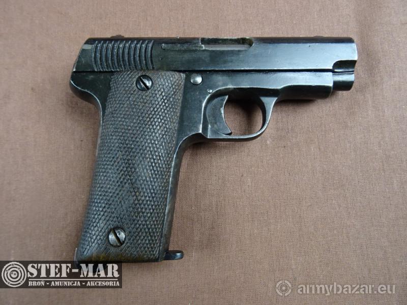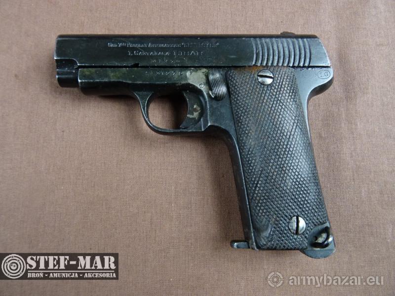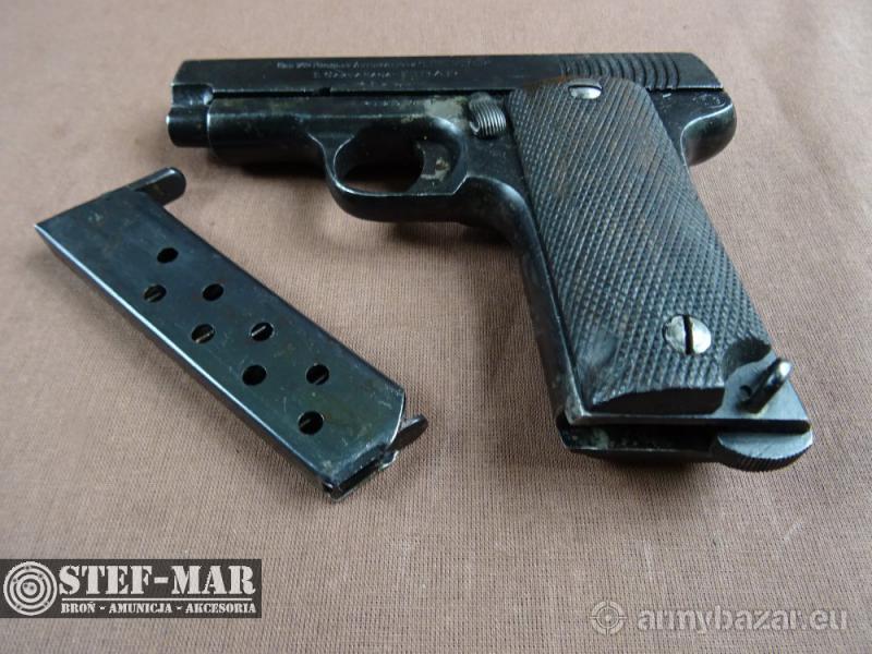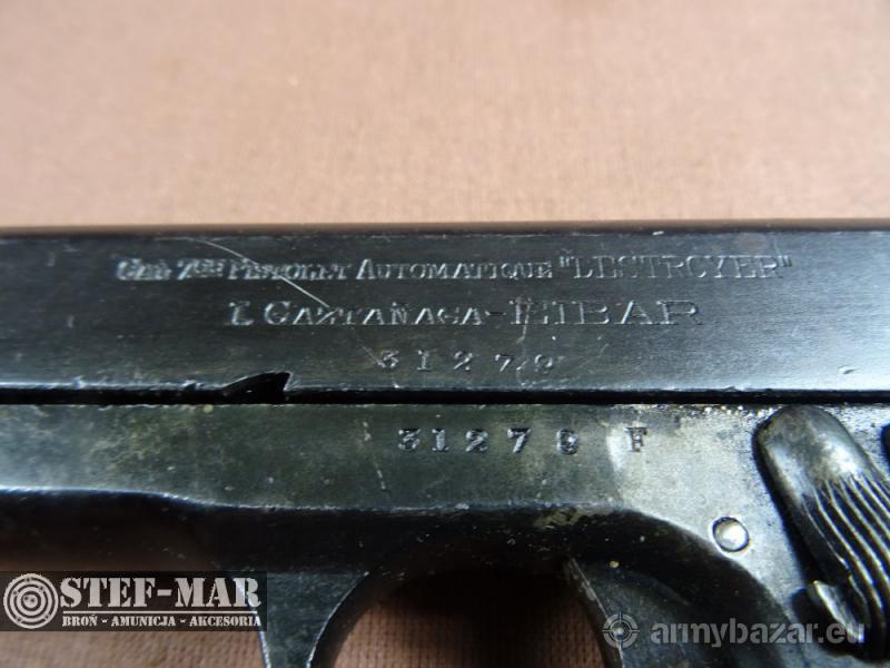 Opis: Broń używana, sprawna w 100%. Produkcja baskijska z 1913r. na wzorze Browning wz.1906. Jest to poprzednik polskiej Cebry. Broń całkowicie zgodna numerycznie. Stan broni dobry, oksyda miejscowo powycierana. Stan lufy jest idealny, gwint wyraźny. Broń po przeglądzie rusznikarskim, przestrzelona na strzelnicy - kal: 7,65mm - dł całk: 156mm - dł lufy: 82mm - waga: 824g Do broni dołączam fakturę VAT/fakturę kupna-sprzedaży W razie pytań prosze dzwonić właściciel 501 682 999, biuro 516 904 226 Możliwość dostarczenia broni we wcześniej uzgodnione miejsce w kraju. BROŃ OSTRA! Wymagane jest pozwolenie na broń. Nr broni: 31279 Nr kat: C88