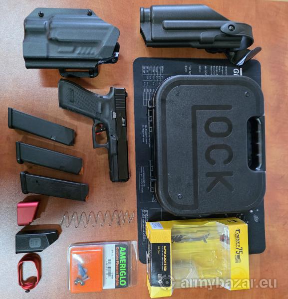 Opis: GLOCK 17 gen. 5 - spust timney alpha, przerywacz ghost Evo elite Dzień dobry, na sprzedaż mam Glocka 17 gen. 5. Broń sprawna w 100%, widoczne drobne ślady użytkowania na zamku. Pomio tego pistolet w stanie bardzo dobrym. W glocku zamontowany jest spust Timney Alpha oraz przerywacz Ghost 3.5 Evo Elite. Dodatkowo na klamce zamontowane są przyrządy światłowodowe - Ameriglo Custom firearm sights. Wartość wszysykich dodatków to ponad 1500 złotych!!! W zestawie broń, walizka, 3 magazynki - 2x oryginalne glock + 1 magazynek magpul, stopka i sprężyna do magazynka (+2), dwie kabury (jedna bez panelu) i dodatkowe części. Dla zainteresowanych więcej informacji i zdjęć prześlę priv. Kontakt SM