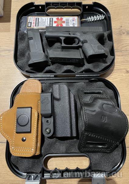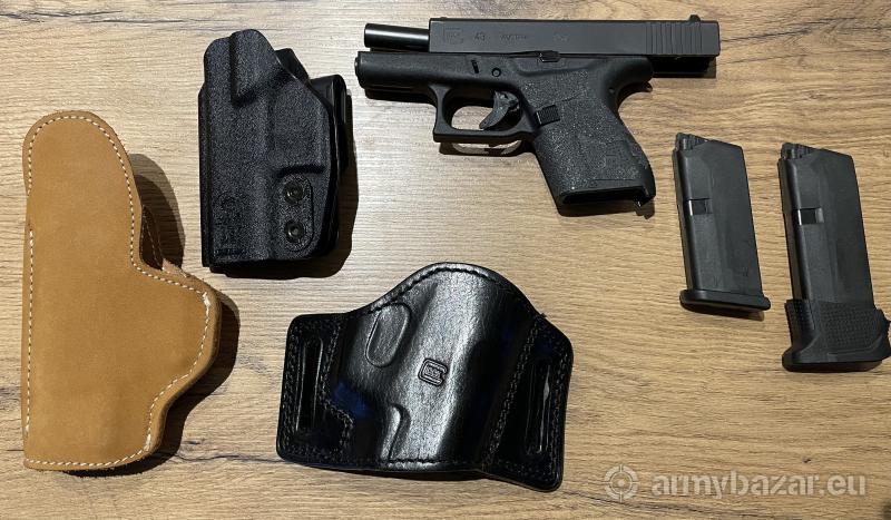 Opis: Sprzedam pistolet Glock 43, w zestawie: - walizeczka - dwa magazynki (+stopka akcesoryjna widoczna na zdj) - oklejony chwyt (można zdjąć) - 3 kabury Mały przebieg. Zapraszam.