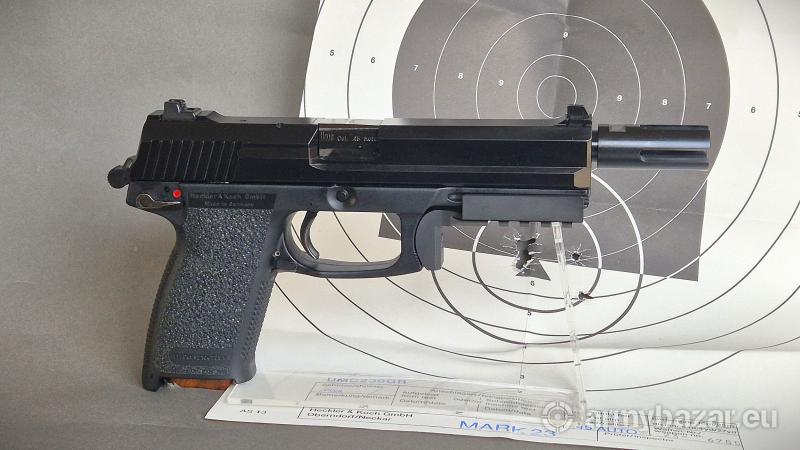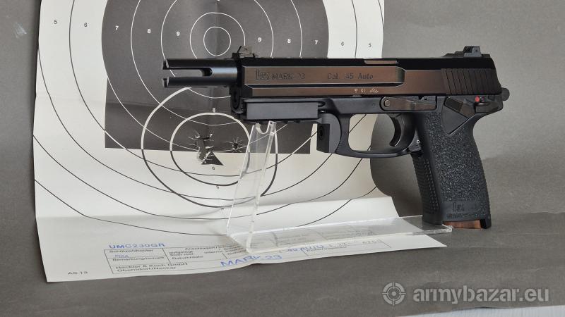 Opis: Pistolet Heckler Koch MK23 kaliber .45 ACP. Jest to Pistolet wyprodukowany przez Heckler Koch jako pistolet ofensywny dla US SOCOM. Jednym z wielu wymagań było, oddanie 30.000 strzałów z amunicji +P oraz 96-cio godzinne zanurzanie pistoletu w piachu z wodą morską. Pistolet w świetnym stanie ( jak nowy ) w torbie Heckler z trzema magazynkami oraz instrukcją i tarczą przystrzelania. Dodatkowo szyna montażowa picatinny, oryginalny tłumik płomienia SOCOM oraz nakrętka maskująca gwint.