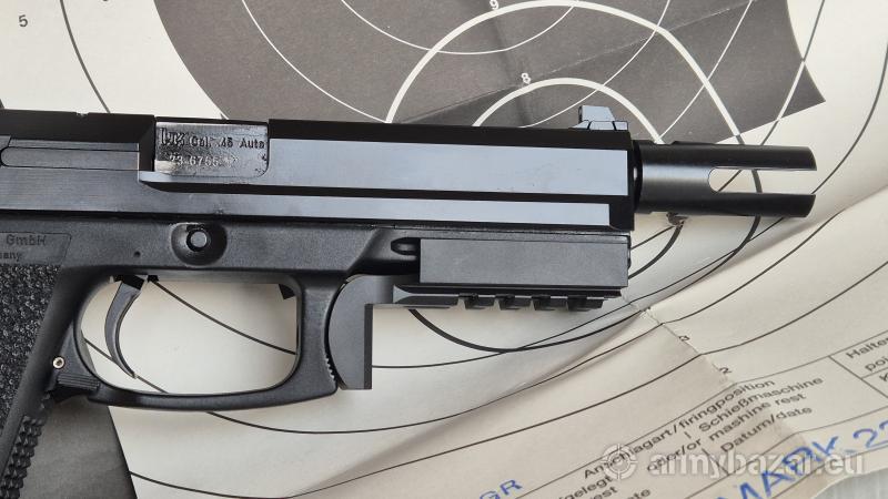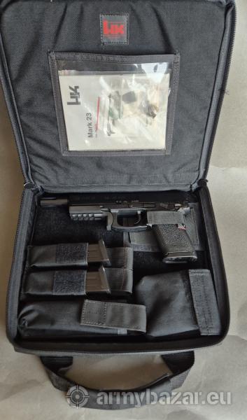 Opis: Pistolet Heckler Koch MK23 kaliber .45 ACP. Jest to Pistolet wyprodukowany przez Heckler Koch jako pistolet ofensywny dla US SOCOM. Jednym z wielu wymagań było, oddanie 30.000 strzałów z amunicji +P oraz 96-cio godzinne zanurzanie pistoletu w piachu z wodą morską. Pistolet w świetnym stanie ( jak nowy ) w torbie Heckler z trzema magazynkami oraz instrukcją i tarczą przystrzelania. Dodatkowo szyna montażowa picatinny, oryginalny tłumik płomienia SOCOM oraz nakrętka maskująca gwint.