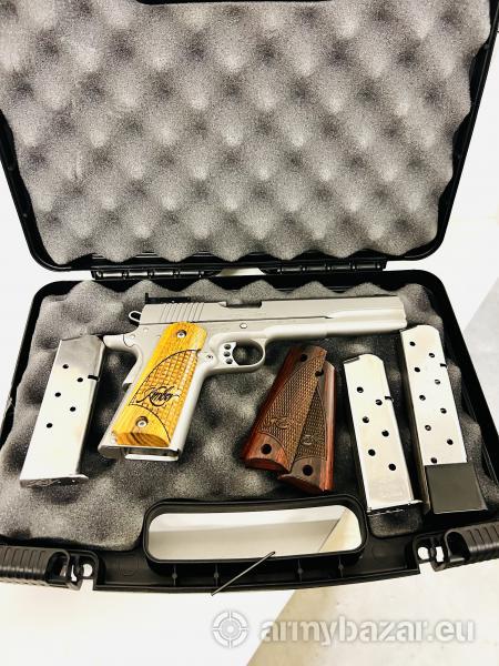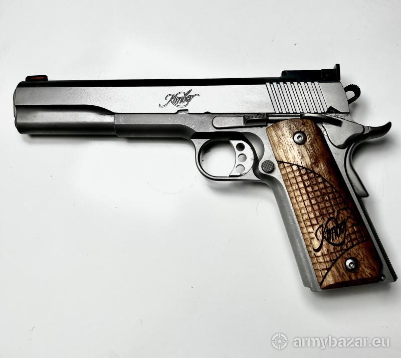 Opis: Kimber 1911 Stainless Target 45 ACP. Lufa 6 cali ! Super celna broń. Regulowane przyrządy. Dodatkowy przedłużony magazynek (razem 3 w komplecie). Dwie dodatkowe drewniane okładziny (trochę grubsze od oryginalnych). Idealny stan. Maks 400 kulek przeleciało. Głównie mieszka w szafie i się nudzi.