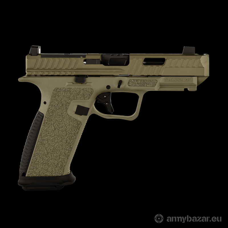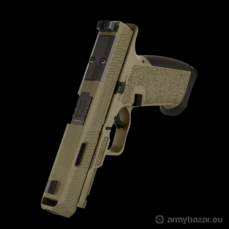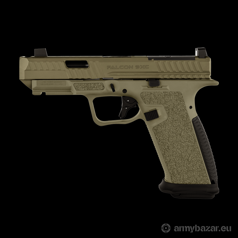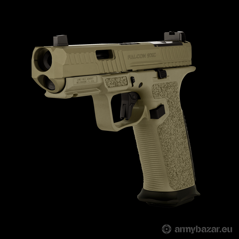 Opis: Pistolet LFA Falcon 9XC kal. 9x19 mm kaliber: 9x19 (gwint 1-10") zamek ze stali nierdzewnej posiadający kompensator w postaci górnego otworu, wycięcie optic ready pod standard RMR (śruby 6x32 x 7/16) obustronny zaczep zamka chwyt polimerowy z antypoślizgową powierzchnią, z wysuniętymi thumb restami, lejek gniazda magazynka Wymiary dł/szer./wys.: 193 mm/25 mm/139 mm długość zamka: 181 mm długość lufy: 102 mm lufa matchowa z kanelowaniem pojemność magazynka: 17 naboi (standard Glock), 2 magazynki Magpul w zestawie opór spustu: około 2,6 kg masa bez magazynka: 670 g muszka z trytem w zestawie pokrowiec transportowy, flaga bezpieczeństwa, 2 magazynki dostępne kolory: FDE